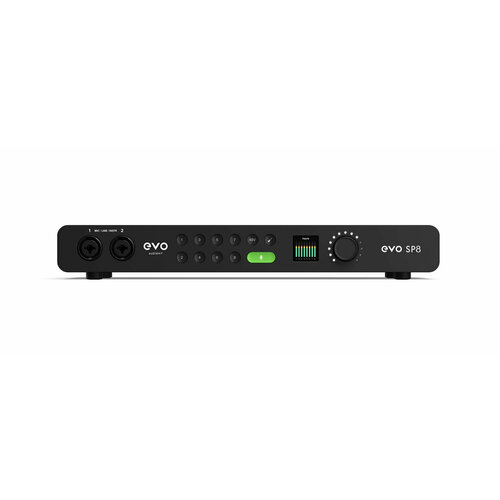 Audient EVO SP8 – это восьмиканальный предусилитель со встроенным ЦАП/АЦП и подключением по ADAT. Модель станет эффективным расширителем для звуковых интерфейсов с ADAT. Внешний вид устройства практически идентичен звуковой карте EVO 16, девайс оснащается теми же переключателями выбора каналов и функций, цветным ЖК-дисплеем и большим поворотным регулятором. EVO SP8 поставляется с функцией Smartgain, предлагает восемь предусилителей с входами на комбинированных разъёмах XLR/TRS (принимают как микрофонные, так и линейные источники) и способен обеспечить усиление до 58 дБ. Первые два входа также принимают сигналы инструментального уровня и расположены на передней панели, в то время как восемь линейных выходов на разъемах TRS располагаются на задней стороне устройства. Вход/выход ADAT устройства обеспечивается четырьмя оптическими разъёмами, кроме этого, имеется вход Wordclock для синхронизации преобразования в EVO 16 или другой звуковой интерфейс. Также присутствует порт USB-C, используемый только для обновления прошивки. Предусилитель обладает прочным стальным корпусом с нескользящими резиновыми ножками, а в качестве дополнительной опции доступны проушины для стойки. Помимо прочего, предоставлен внутренний источник питания, питающийся от стандартного сетевого разъема IEC.