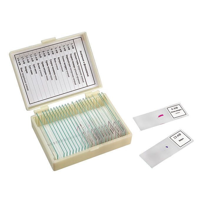 Наборы готовых препаратов для микроскопа специально созданы для проведения самостоятельных исследований. Препараты сгруппированы в 3 набора: ботаника и зоология, анатомия и физиология, общая биология. Чтобы природное любопытство не иссякло, лучше всего избирать наглядные и выразительные способы донесения знаний. Микропрепараты подобраны таким образом, чтобы знакомство с биологией проходило наиболее увлекательно. Все микропрепараты подписаны, пронумерованы и помещены в пластиковые кейсы с индивидуальными ячейками, поэтому они не перепутаются и не растеряются в процессе исследований. Размеры готовых препаратов стандартные (25 мм х 76 мм) и подходят для использования с любым биологическим микроскопом Микромед. 14 образцов, 10 предметных стекол, покровные стекла. В наборе 1-А Костная ткань Продольное сечение 2-А Гладкие мышцы Цельный организм 3-А Нервный узел Поперечное сечение 4-А Стенки желудка сечение 5-А Артерия сечение 6-А Вена сечение 7-А Сперма человека мазок 8-А Кровь человека мазок 9-А Кровь лягушки мазок 10-А Легкие сечение 11-А Срез кости 12-А Срез кожи 13-А Нейрон 14-А Язык Продольное сечение Комплектация Образцы – 14 шт Предметные стекла – 9 шт Покровные стекла – 20 шт Пластиковый кейс