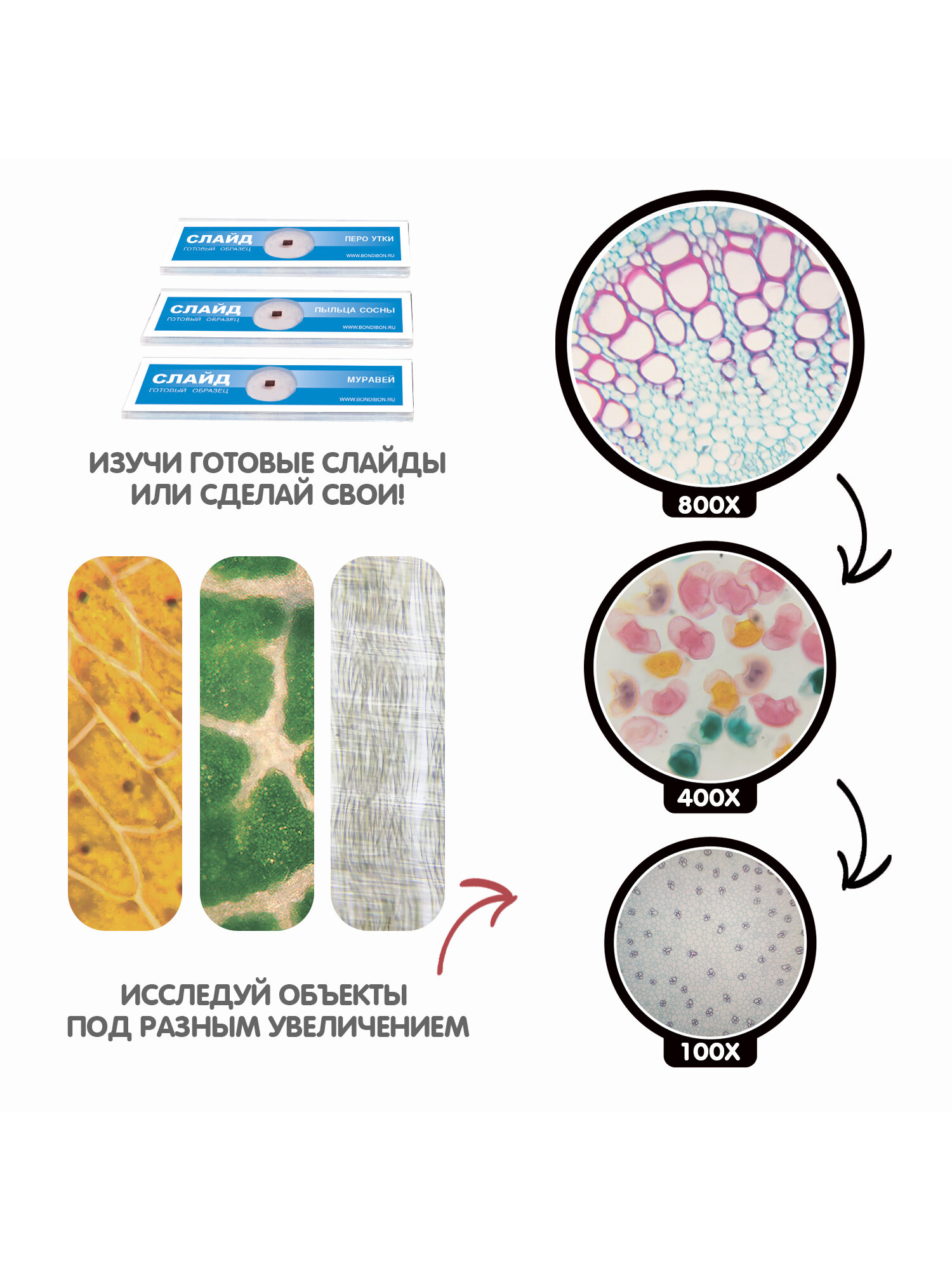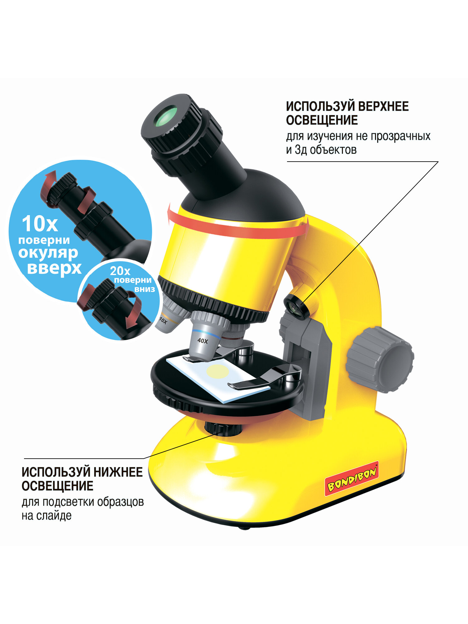 Купить Микроскоп 40-800X для 2D и 3D объектов с поворотным окуляром и подсветкой Французские опыты Науки с Буки Bondibon с доставкой по всей России.