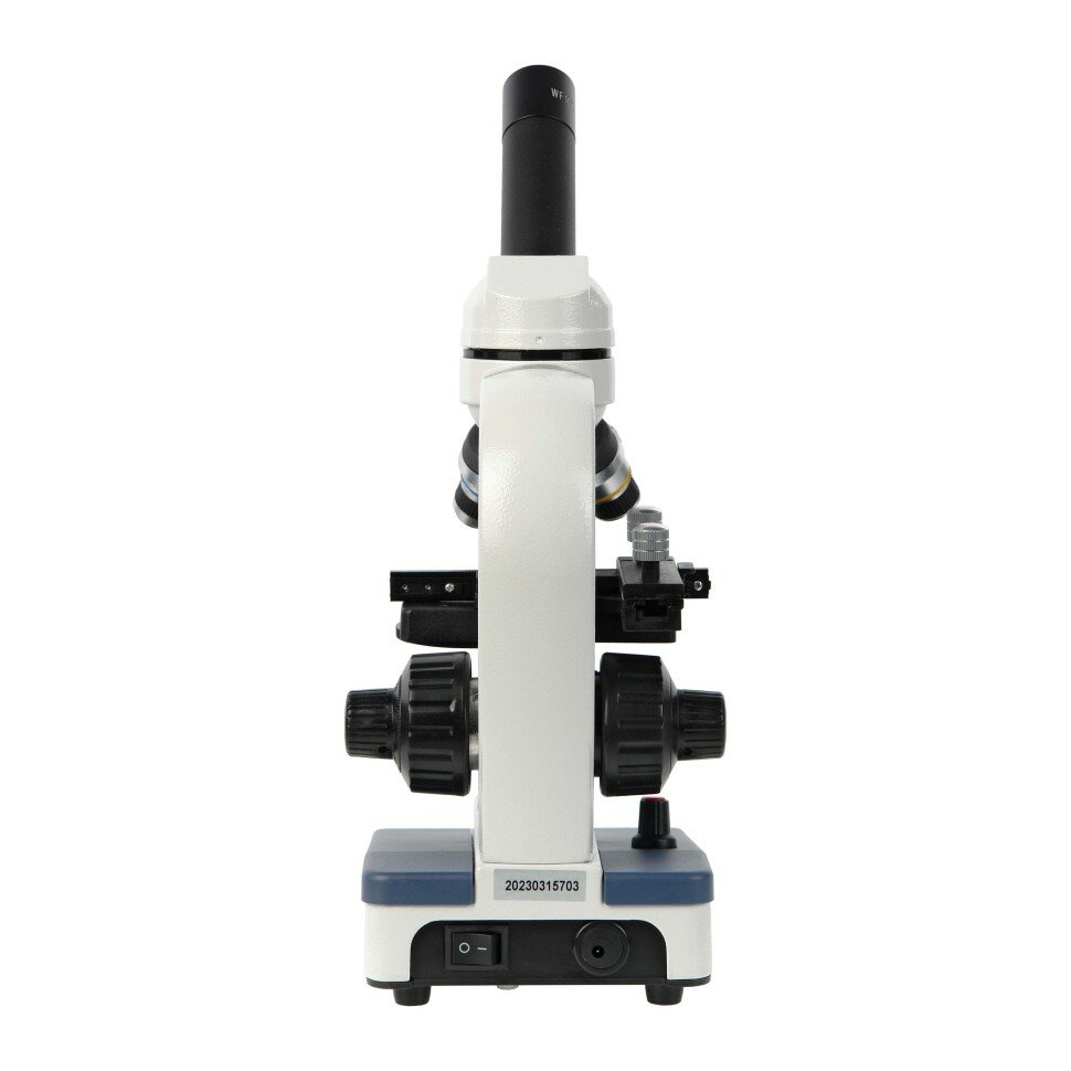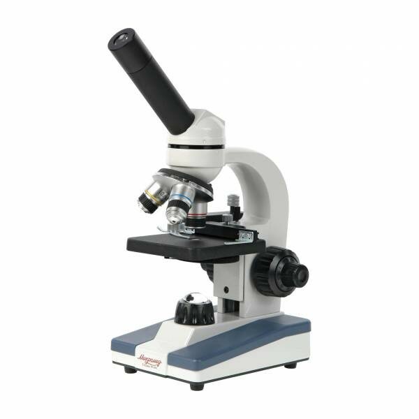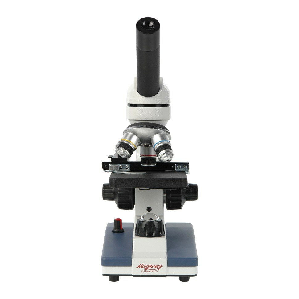 Микроскоп биологический Микромед С-11 (вар. 1М LED) предназначен для наблюдения и исследования препаратов в проходящем свете по методу светлого поля. В микроскоп встроена светодиодная подсветка проходящего света, позволяющая исследовать прозрачные микропрепараты (срезы растений, мазки, жидкости и т. д.). Подсветка может писаться как от сети, как и работать автономно от батарей, что позволяет использовать микроскоп для наблюдений где угодно: в учебных классах, на природе, в поездках и в любых других ситуациях, независимо от того, есть доступ к электросети или нет. Монокулярная визуальная насадка микроскопа позволяет производить наблюдение одним глазом. Поворотная насадка вращается на 360°, позволяя выбрать пользователю удобное положение для наблюдений и одновременных манипуляций исследуемым образцом. Угол наклона визуальной насадки 45° – это наиболее эргономичное положение окуляра в данном классе микроскопов. В комплект микроскопа входят окуляры увеличением 10х и 20х и посадочным диаметром 23.2 мм. Так же возможно дополнительно приобретение окуляры с другим увеличением или со шкалой. Микроскоп Микромед С-11 (вар. 1М LED) укомплектован объективами-ахроматами с увеличением 4х, 10х, 40х. Для удобства пользователя на оправе каждого объектива кроме этих значений, также имеется цветовая маркировка, соответствующая увеличению. Объективы устанавливаются в револьверное устройство, оснащеное гнездами для трех объективов. Смена объективов производится вращением револьверного устройства до фиксации положения выбранного объектива. Это быстрый и удобный способ сменить увеличение прямо во время исследования. Объектив с увеличением 40 крат имеет пружинящую оправу, которая предохраняет от случайного механического повреждения фронтальной линзы объектива и покровного стекла при исследовании на больших увеличениях. Объективы, входящие в комплект микроскопа, рассчитаны на оптическую длину тубуса 160 мм, и толщину покровного стекла 0,17 мм. Клеммы с пружинным механизмом позволяют удобно расположить препарат на предметном столике. Предметный столик с препаратоводителем позволяет перемещать образец в двух направлениях (продольном и поперечном) с помощью вращения двух специальных рифленых ручек. Отсчетные шкалы на линейках помогают установить образец в нужное положение. Перемещение осуществляется плавно и точно за счет специальной смазки в направляющих. В микроскопе освещение объекта осуществляется светодиодным источником света с линзовым коллектором – для максимальной концентрации светового пучка. Дополнительно к линзовому коллектору в микроскопе имеется диск с набором диафрагм разных диаметров, размещенный под столиком. Установка диафрагм разных размеров помогает достичь максимального контраста наблюдаемого изображения при использовании объективов различного увеличения. При работе с объективами большого увеличения требуется более высокая яркость для получения хорошего качества изображения, а при работе с объективом малого увеличения требуется уменьшить освещенность объекта. В микроскопе реализована коаксиальная схема фокусировки – рукоятки грубой и точной настройки расположены по обеим сторонам штатива, чтобы пользователь мог работать и правой, и левой рукой. Достоинства Оптические элементы из стекла и металлическая ко