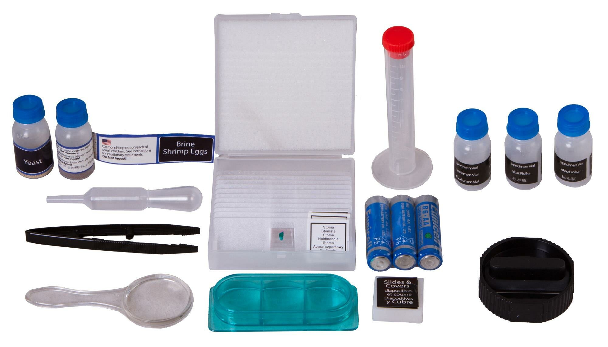 С микроскопом Bresser Junior 40x-640x юный исследователь сможет погрузиться в мир удивительных крошечных созданий. Маленький ученый научиться изучать микропрепараты, выращивать артемию, проводить настоящие биологические опыты. В комплекте есть все необходимое для создания дома настоящей исследовательской лаборатории. Микроскоп Bresser Junior 40x-640x прост в использовании. Он поставляется в собранном виде, не имеет съемных частей и будет понятен даже очень юному пользователю. В микроскоп уже установлены три объектива разной кратности – 4х, 10х и 40х. Вращая револьверное устройство, можно быстро менять увеличение прямо во время наблюдений. В окулярной трубке вы найдете удобный двухпозиционный окуляр. Он заменяет собой сразу два окуляра – 10х и 16х. Чтобы сменить увеличение, нужно лишь немного повернуть окуляр вокруг своей оси. В совокупности Bresser Junior 40x-640x позволяет рассматривать образцы при увеличении от 40 до 640 крат. Микроскоп имеет встроенную светодиодную подсветку. Она расположена под предметным столиком, работает от батареек и имеет регулировку яркости. Благодаря этому микроскопом удобно пользоваться даже вне стен дома: на даче, в школе, на природе. Юный ученый сможет брать Bresser Junior 40x-640x с собой повсюду и изучать любые заинтересовавшие его образцы окружающего мира. В комплекте с микроскопом идет большой набор для проведения опытов. В коробке вы найдете готовые микропрепараты, флаконы с образцами, предметные и покровные стекла, инструменты юного биолога. Приступить к исследованиям можно будет прямо после вскрытия коробки! А уже через несколько дней выращенная самостоятельно артемия станет предметом гордости маленького ученого. Особенности: Яркий детский микроскоп Двухпозиционный окуляр Увеличение от 40х до 640х Набор для опытов в комплекте Светодиодная подсветка Питание от батареек Комплектация: Микроскоп Готовые микропрепараты – 3 шт. Предметные стекла – 8 шт. Покровные стекла – 8 шт. Наклейки для стекол – 8 шт. Флакон с дрожжами Флакон с артемией Инкубатор для разведения артемии Флаконы – 3 шт. Микротом Пинцет Пипетка Лупа Мерный стаканчик Батарейки типа АА – 3 шт. Инструкция по эксплуатации