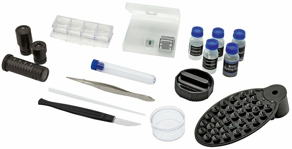 | Подробная комплектация | микроскоп; широкопольные окуляры: WF10x, WF20x; объективы: 4x, 10x, 40x; линза Барлоу 2х; флакон с дрожжами; флакон со смолой для изготовления препаратов; флакон с морской солью; флакон с артемией; пустой флакон; инкубатор для разведения артемии; микротом; предметные стекла – 5 шт; покровные стекла – 5 шт.; готовые микропрепараты – 5 шт.; батарейки типа АА – 3 шт.; пробирка; пинцет; препаровальная игла; скальпель; контейнер; адаптер для смартфона; пылезащитный чехол; инструкция по эксплуатации и гарантийный талон |