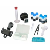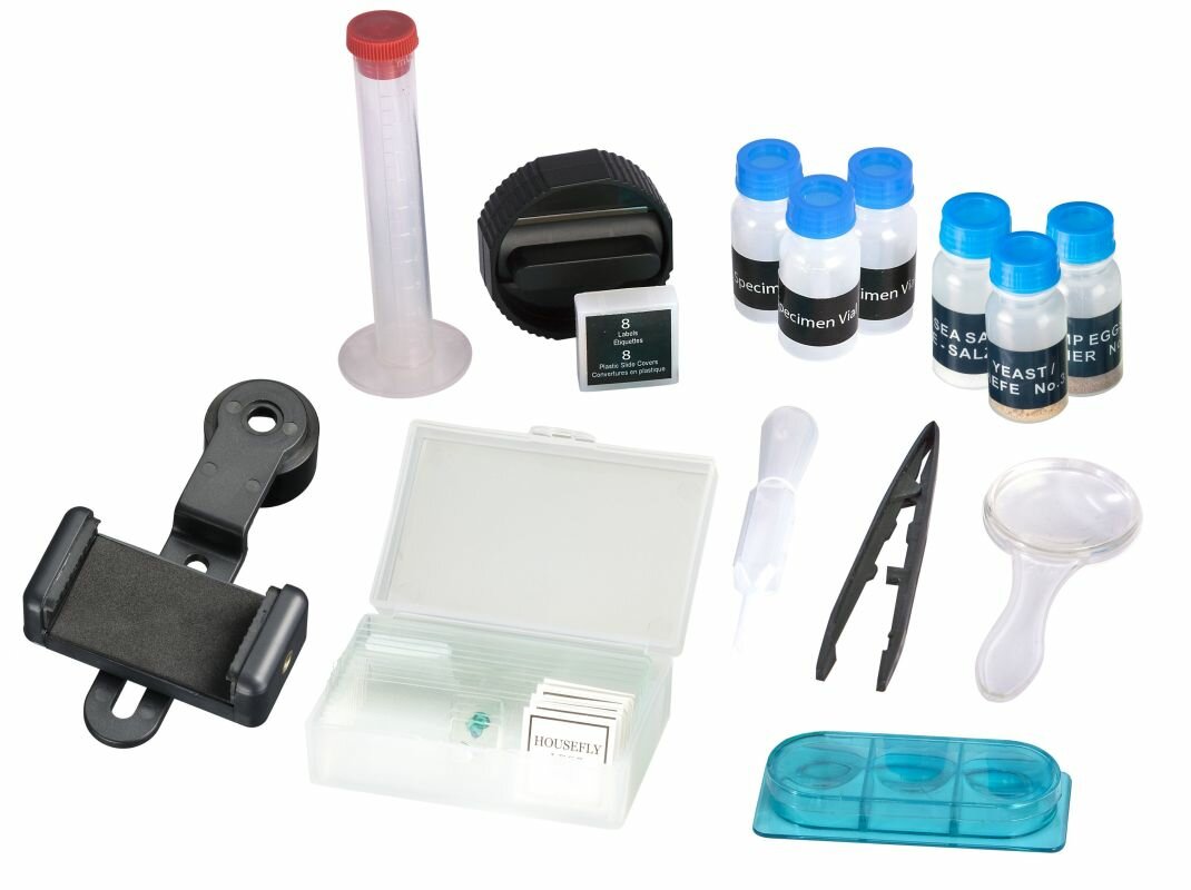 | Комплектация | микроскоп bresser national geographic 40–640x, окуляр wf10x–wf16x, объективы: 4х, 10х и 40х, 3 готовых микропрепарата, 8 покровных и предметных стекол с этикетками, 2 препарата (дрожжи и артемия), флаконы, коробочка для разведения артемии, микротом, пинцет, пипетка, маленькая лупа с ручкой, мерный стаканчик, адаптер для смартфона, 2 батарейки типа АА, инструкция по эксплуатации |