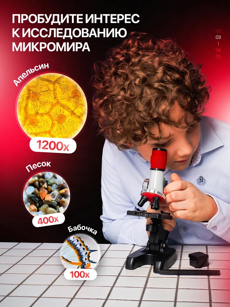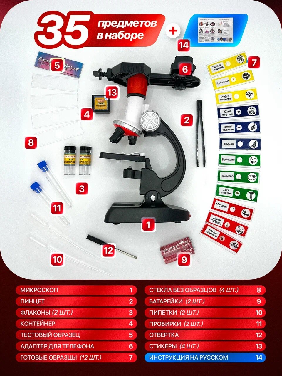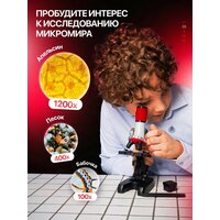 Оптический микроскоп с образцами для проведения “всех типов” научных исследований и опытов и комплектацией многоразовых инструментов. Создавайте и рассматривайте *жидкие* и *твердые* образцы всей семьей, пробуждая у ребенка интерес к науке. Игрушка + настоящий профессиональный лабораторный гаджет для предметного изучения бесконечного множества образцов из окружающего мира. Исследуйте кусочек лука, как лопаются пузырьки газировки или движение бактерии в водопроводной воде с увеличением от 100 до 1200 раз. В наборе есть держатель для телефона (адаптер) для подключения смартфона. Вы и дети можете рассматривать все в деталях на экране мобильной электроники и создавать цифровое видео в процессе наблюдения. Добавили микропрепараты (готовые образцы растений и насекомых) для развивающих экспериментов. Коробку комплектуем с инструкцией *на русском языке* + консультируем по настройке микроскопа, для этого напишите нам. Наши контакты есть на последних фото к товару. Биологический микроскоп монокулярный оснащен 3 режимами увеличения и подсветкой, что повышает качество изображения. Установили стеклянный окуляр с кольцом ручной регулировки, предметный столик и лампа подсветки из пластика и стекла. При производстве используется объектив с стеклянными линзами. С компактным, портативным микроскопом дети погружаются в игровой процесс и чувствуют себя начинающим профессиональным ученым. Он является универсальным выбором для изучения химии и ботаники, удивительных домашних развлечений вместе со взрослыми, развития навыков во время учебного процесса. Интересная подарочная идея, сюрприз для маленьких девочек и мальчиков, юных школьников и даже подростков на день рождения, новый год, 1 сентября, 8 марта, 23 февраля и другой праздник. В магазине есть 12 микроскопов с микропрепаратами разной формы, цвета, материала и комплектации. Выбирите тот, что больше понравится. ! - Сейчас идут акции и распродажи, вы можете купить наш микроскоп с стеклами в подарок со скидкой.