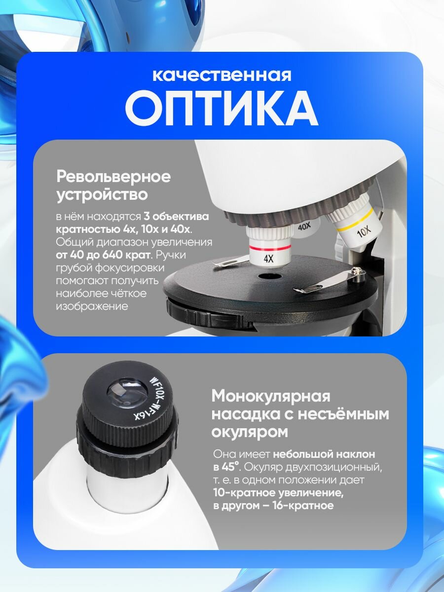 Оптическая система состоит из револьверного устройства с установленными объективами и несъемного двухпозиционного окуляра. Кратность объективов – 4х, 10х и 40х, а кратность окуляра – 10х или 16х (зависит от выбранного положения). Общее увеличение микроскопа составляет от 40 до 640 крат. Этих возможностей не хватит для изучения бактерий, но с помощью этого микроскопа можно получить представление об устройстве микромира и значительно расширить свои знания в области микробиологии. Монокулярная насадка имеет наклон 45°, что делает длительные наблюдения более удобными. Настройка резкости производится с помощью ручек грубой фокусировки, расположенных на корпусе.
