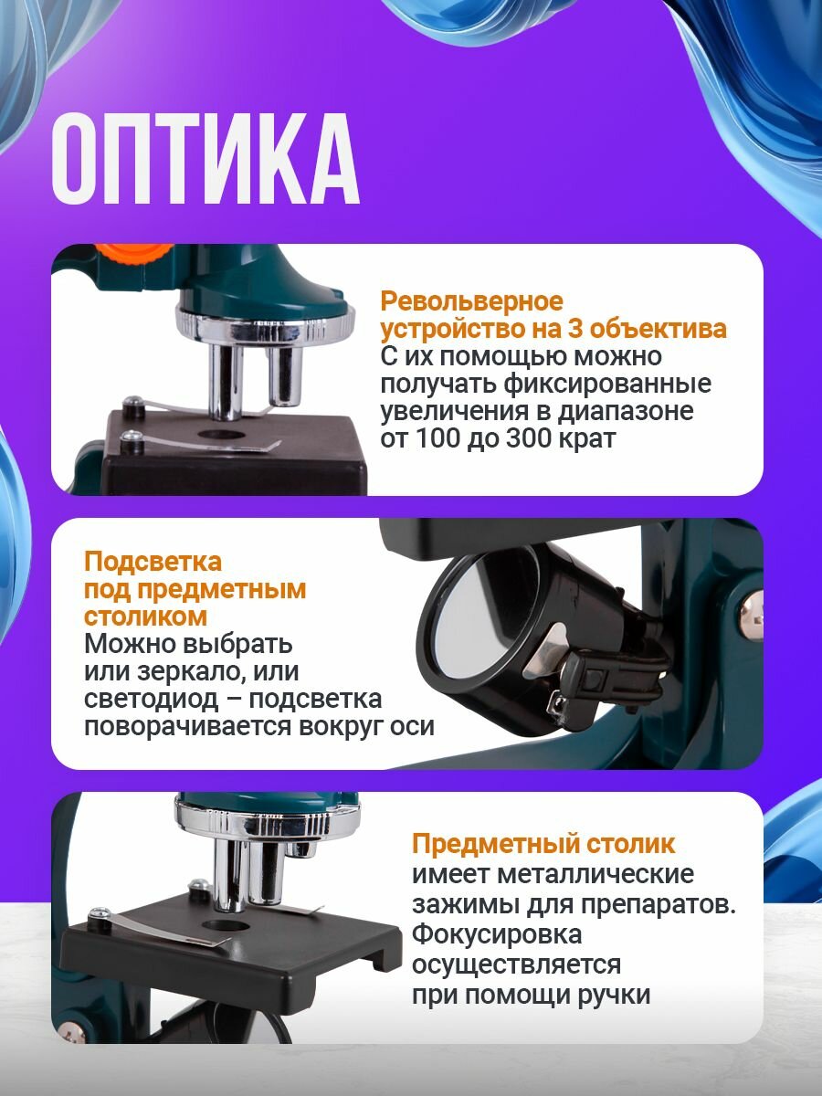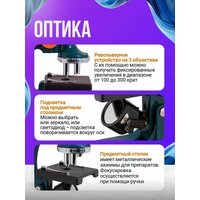 Микроскоп Levenhuk LabZZ M1 – детский микроскоп с увеличением до 300 крат. Он предназначен для изучения прозрачных объектив и комплектуется готовыми микропрепаратми. Микроскоп станет прекрасным подарком ребенку, интересующемуся наукой и биологией. Благодаря простому управлению подойдет даже для самых маленьких детей. Для смены увеличения микроскопа нужно лишь повернуть револьверную головку. Можно выбрать увеличение 100х, 200х или 300х. Готовые микропрепараты размещаются на предметном столике и фиксируются специальными металлическими зажимами. Для настройки резкости предметный столик можно поднять или опустить. Подсветка микроскопа состоит из двух элементов. Зеркало используется при достаточном внешнем освещении, а встроенная подсветка – если надо ярко осветить образец. Подсветка расположена под предметным столиком и работает от двух батареек типа АА (нет в комплекте). В комплект подставки входит небольшой набор для опытов. Он включает готовые микропрепараты, инструменты для приготовления собственных образцов, читые предметные и покровные стекла с наклейками. Особенности: Микроскоп для детей Увеличение до 300 крат Подсветка работает от батареек В комплекте есть готовые микропрепараты Легкий и прочный корпус Характеристики: Тип микроскопа: световые оптические, биологические Тип насадки: монокулярные Материал оптики: оптический пластик Увеличение, крат: 100–300 Окуляры: 10х Объективы: 10х, 20х, 30х Револьверное устройство: на 3 объектива Фокусировка: грубая Корпус: пластик Подсветка: зеркало Питание от батареек: 2 батарейки типа АА (нет в комплекте) Назначение: школьные учебные, детские Расположение подсветки: нижняя Метод исследования: светлое поле Набор для опытов в комплекте: есть Комплектация: Микроскоп Окуляр Пипетка Готовые микропрепараты (2 шт. ) Предметные стекла (2 шт. ) Покровные стекла (5 шт. ) Наклейки для стекол (5 шт. ) Фиксатор Морская соль
