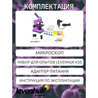 микроскоп, объективы 4х, 10х и 40х, окуляр WF10х, предметный столик с зажимами, диск с диафрагмами, конденсор, встроенные нижний и верхний осветители на светодиодах, сетевой адаптер (питание 220 В, 50 Гц), набор для опытов Levenhuk K50 («Интересный микроскоп, Изучаем микромир»), пинцет, инкубатор для артемии, микротом, флакон с дрожжами, флакон со смолой для изготовления препаратов, флакон с морской солью, флакон с артемией (морским рачком), 5 готовых образцов и 5 чистых предметных стекол, пипетка, пылезащитный чехол, инструкция по эксплуатации и гарантийный талон