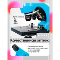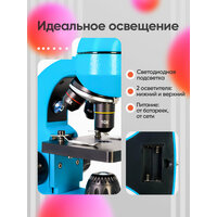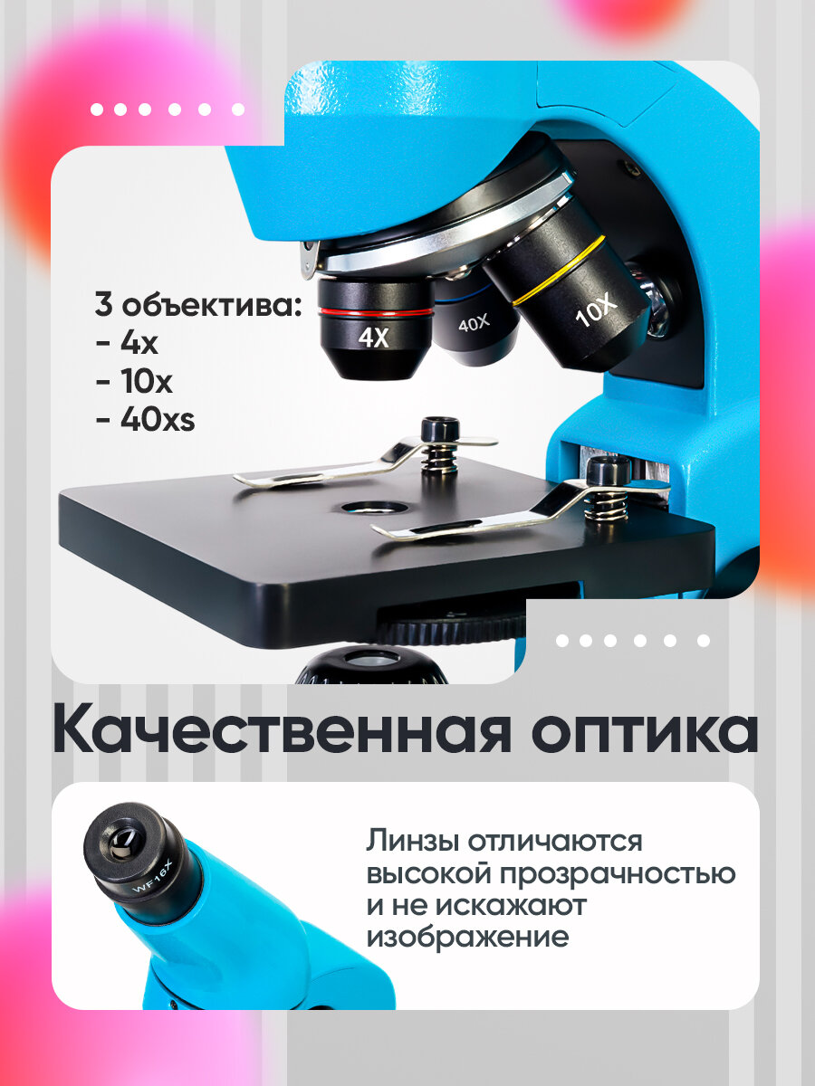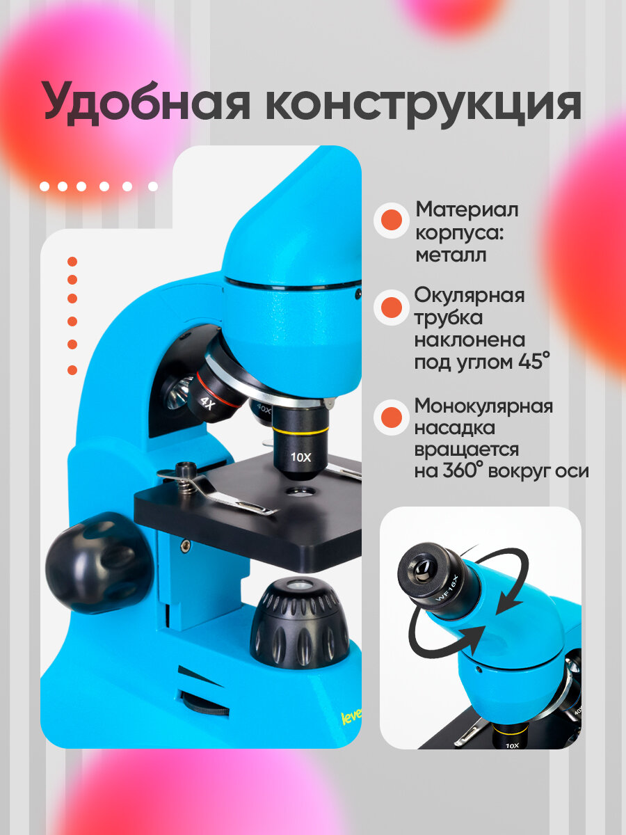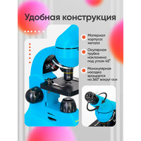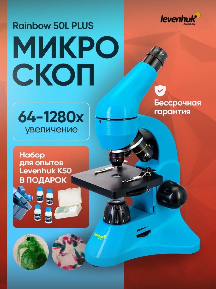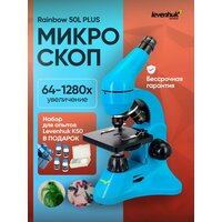 Микроскоп Levenhuk Rainbow 50L PLUS Azure\Лазурь – это качественная просветленная оптика, универсальная подсветка, надежная конструкция и потрясающий современный дизайн. Эта модель прекрасно подойдет школьнику – в комплекте есть все для первого знакомства с микромиром. Кроме того, микроскоп пригодится и опытным пользователям – его технические характеристики позволяют исследовать самые разнообразные препараты. Яркий корпус лазурного цвета будет отлично смотреться и в комнате подростка, и на рабочем столе взрослого.
