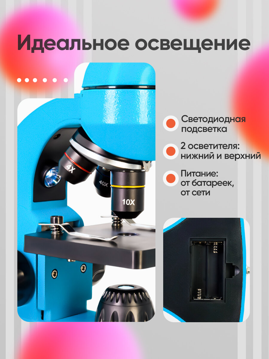 Благодаря двойной светодиодной подсветке микроскоп подходит для работы с препаратами разной степени прозрачности. Чтобы изучить шерсть домашних животных, кристалл сахара, тонкий срез растения или другой прозрачный объект, включите нижнюю подсветку. Верхний осветитель нужен для работы с непрозрачными образцами, например бумагой или металлом. Полупрозрачные объекты хорошо различимы, когда оба осветителя работают одновременно. Яркость подсветки регулируется, поэтому для каждого препарата легко настроить оптимальный уровень освещенности.