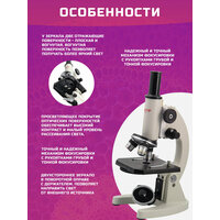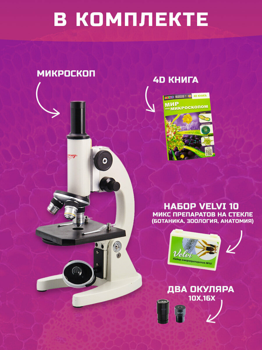 Микроскоп школьный Микромед С-12 в комплекте с 4D книгой и набором микропрепаратов Velvi №10. Увеличение от 40х до 640х. Зеркальный двухсторонний осветитель. Ахроматические объективы. Револьверное устройство на 3 объектива. Металлический штатив и основание. Школьный микроскоп С-12 оснащен объективами с линзами из оптического стекла – 4x/0.1, 10x/0.25 и 40x/0.65. Благодаря ахроматической коррекции объективов наблюдатель видит в окуляр отчетливое и яркое изображение. В комплект биологического микроскопа входят окуляры широкого поля WF10х/18 и WF16х/15 с линейным размером поля зрения 18 мм и 15 мм. С окуляром 10х диапазон увеличений составляет от 40х до 400х, с окуляром 16х – от 64х до 640х. При работе с данной моделью лабораторного микроскопа в качестве источника света может быть использован любой внешний источник – солнце, свет от окна, настольная лампа, светодиодный фонарь. Осветитель микроскопа Микромед С-12 имеет поворотный диск с 5-ю отверстиями различных диаметров. Диск расположен под предметным столиком. Отверстия выполняют функцию апертурных диафрагм разного размера, что позволят добиваться повышения контраста изображения. Микроскоп школьный Микромед С-12 снабжен двухступенчатым фокусировочным механизмом, это позволяет производить и грубую и тонкую фокусировку. Фокусировочный механизм на основе зубчато-реечной передачи расположен в штативе микроскопа и имеет винтовой ограничитель хода фокусировки для предотвращения повреждения исследуемого образца и объектива. Штатив и основание микроскопа изготовлены методом литья под давлением из алюминиевого сплава, все детали механизма фокусировки также металлические. Отсутствие пластика, как материала для важных механических узлов, большая редкость для микроскопов бюджетного класса. Такая конструкция гарантирует длительный срок эксплуатации микроскопа, прочность и устойчивость конструкции, стабильность и точность настроек.