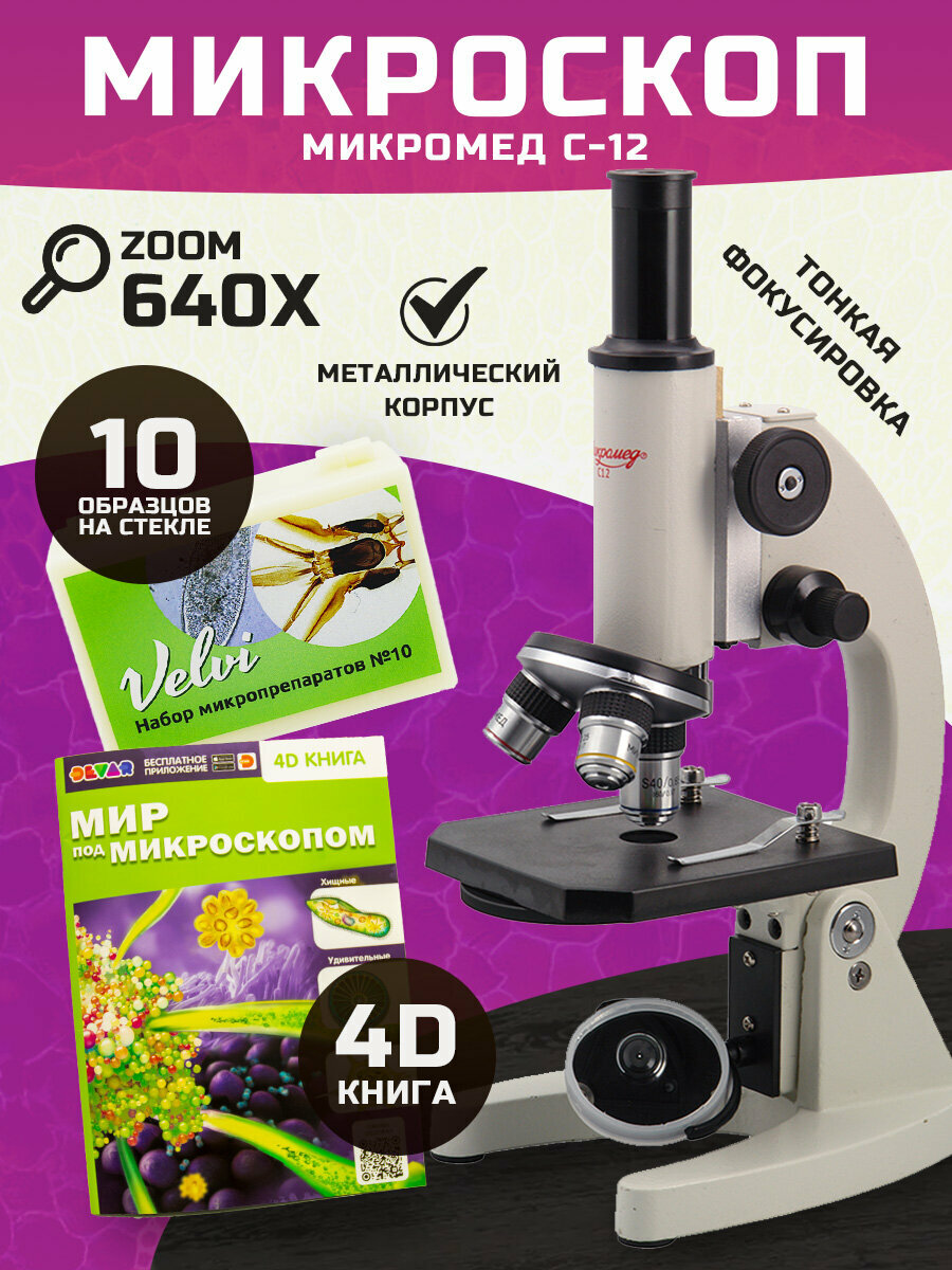 Купить Микроскоп Микромед «C-12» 40x-640x, в комплекте c 4D книгой и препаратами Velvi №10 с доставкой по всей России. Микроскоп Микромед «C-12» 40x-640x, в комплекте c 4D книгой и препаратами Velvi №10: сравнение цен, характеристики, фото, актуальное наличие и цены.