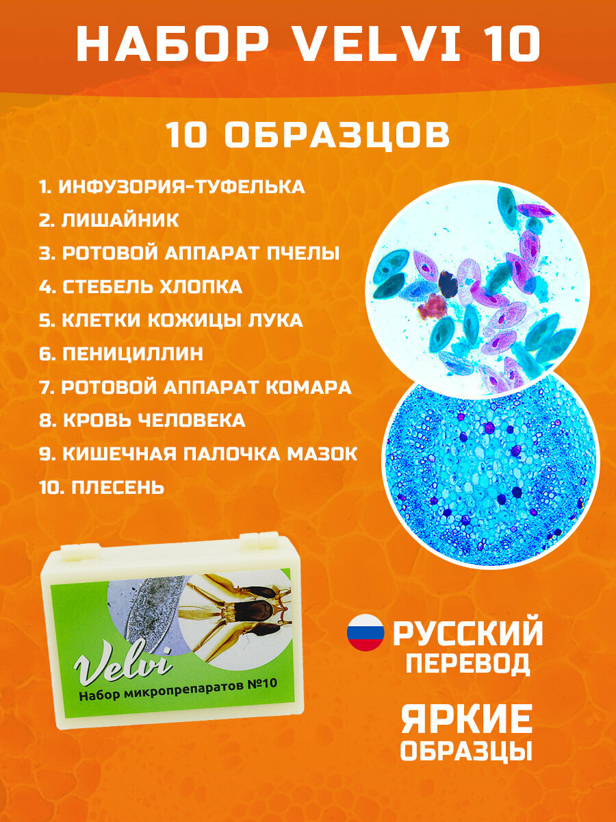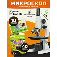 Микроскоп школьный Эврика 40х-640х (зеркало, LED) в комплекте с набором микропрепаратов Velvi10 и 4D книгой "Мир под микроскопом". Микроскоп оснащен «сухими» ахроматическими объективами с линзами из оптического стекла – 4x/0.1, 10x/0.25 и 40x/0.65. Это позволяет наблюдать в окуляр отчетливое и яркое изображение, а при использовании дополнительной камеры записывать изображения и видео отличного качества. В комплект микроскопа входят окуляры широкого поля WF10х/18 и WF16х/15 с линейным размером поля зрения 18 мм и 15 мм соответственно. Микроскоп Эврика 40х-640х предназначен для исследований в светлом поле и имеет два осветителя для работы в проходящем свете. Светодиодный осветительный блок имеет встроенный светодиод с регулируемой яркостью и коллективную линзу, обеспечивающую равномерное интенсивное освещение в плоскости объекта. Светодиод имеет цветовую температуру 6500⁰К и мощность 0.75 Вт. Осветитель микроскопа света имеет поворотный диск с 5-ю отверстиями диаметром 4, 6, 7, 14 и 17 мм. Отверстия выполняют функцию апертурных диафрагм разного размера, это позволят добиваться повышения контраста изображения, особенно при наблюдении светлых и прозрачных малоконтрастных объектов. В качестве второго источника света может быть использован блок зеркала, представляющий собой двухстороннее зеркало диаметром 50 мм в поворотной оправе с держателем. Все объективы и окуляры школьного микроскопа изготовлены из оптических стекол высокого качества и имеют просветляющее покрытие. Качественная оптика в биологическом микроскопе обеспечивает высокий контраст и резкость при визуальных исследованиях. Фокусировка микроскопа Эврика 40х-640х осуществляется перемещением по вертикали револьвера с объективами и окулярного тубуса относительно неподвижного предметного столика. Фокусировочный механизм на основе прецизионной зубчато-реечной передачи расположен в штативе микроскопа и имеет двухступенчатую конструкцию. Это обеспечивает как грубую фокусировку, так и тонкую. Наличие подобного механизма у учебных микроскопов бюджетного класса большая редкость - как правило такими механизмами оснащаются профессиональные исследовательские микроскопы. Питание осуществляется от встроенного в корпус осветителя литий-ионного аккумулятора 3.7 В, емкостью 300 мА/ч. Аккумулятор обеспечивает непрерывную работу осветителя с максимальной яркостью в течении 8 часов. Зарядка аккумулятора производится от входящего в комплект сетевого зарядного устройства 5 В. Поскольку для зарядки осветителя используется стандартный UCB разъем, его можно подключить к любому внешнему устройству – компьютеру или Power Bank и продолжать исследования.