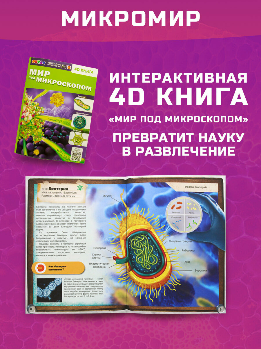 Школьный микроскоп Микромед Эврика 40х-1600х (вар. 2) в комплекте с набором микропрепаратов Velvi №10 и 4D книгой "Мир под микроскопом". Микроскоп комплектуется ахроматическими объективами для сухих исследований – 4x/0.1, 10x/0.25 и 40x/0.65. Камера для микроскопа 1,3 МП. Окуляры 10х, 16х, 20х. Линза Барлоу 2х. Два осветителя на светодиодах. Питание от usb или батарей. Объективы и окуляры этого школьного микроскопа изготовлены из оптических стекол высокого качества и имеют просветляющее покрытие. Качественная оптика обеспечивает высокий контраст и резкость как при визуальных исследованиях, так и при использовании окулярной камеры. Микроскоп с камерой позволяет выводить изображение объекта на экран, делать фото и видео. Биологический микроскоп имеет два осветителя: проходящего и отраженного света. Оба осветителя снабжены коллекторными линзами и имеют бесступенчатую регулировку яркости. Осветитель отраженного света эффективен только с объективами малых увеличений, так как при больших увеличениях объективов рабочее расстояние очень маленькое и падающий свет может перекрываться оправой объектива. Питание осветителей может производиться от 3-х щелочных батареек тип АА или от usb, так же можно отдельно приобрести сетевой адаптер. Осветитель проходящего света имеет поворотный диск с 6-ю отверстиями разного размера. Отверстия выполняют функцию апертурных диафрагм и их размер выбирается исходя из увеличения выбранного объектива, что позволяет добиваться максимального контраста. Также в диск встроены 5 цветных светофильтров. Использование таких фильтров при исследовании малоконтрастных и прозрачных объектов также имеет целью увеличение контраста. Одно отверстие имеет прозрачное стекло для исследований без фильтра. Подбор оптимальной величины отверстия осуществляется опытным путем – чем больше увеличение объектива, тем меньшим должен быть диаметр отверстия. Входящая в комплект цифровая камера 1.3 МП позволяет за считанные секунды превратить оптический микроскоп в цифровой. Камера построена на цветном CMOS сенсоре с физическими размерами 1/3 дюйма, что составляет 4.9х3.6мм с полным разрешением 1280х964 точек и размером пикселя 3.75 х 3.75 мкм. Такой крупный размер пикселя позволяет достигать высокой чувствительности сенсора с малым уровнем шумов, что особенно важно при работе с большими увеличениями. Основание и штатив микроскопа изготовлены из ударопрочного пластика ABS, что способствует прочности и безопасности конструкции при небольшой массе. Механическая конструкция микроскопа обеспечивает надежную защиту оптики и механизмов от ударов и вибраций, стабильность и точность настроек.