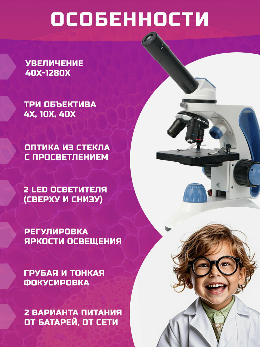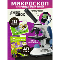 Микроскоп школьный Микромед Эврика SMART 40х-1280х в комплекте с набором препаратов Velvi №10 и 4D книгой "Мир под микроскопом". В комплект входят окуляры широкого поля WF10х/15 и 16х/11. Основание и штатив микроскопа - металлические. В комплекте удобный кейс для хранения и переноски микроскопа. Благодаря линзе Барлоу 2х, максимальное увеличение микроскопа может вырасти до 1280х. Линзу Барлоу можно сдвигать вдоль оптической оси окулярного тубуса, плавно изменяя тем самым увеличение. В комплекте учебного микроскопа имеется специальный держатель для смартфона. Это позволяет исследователю записывать необходимые изображения и видео, не отрываясь от процесса исследований. Школьный микроскоп Эврика SMART имеет два осветителя - проходящего и отраженного света. Осветитель отраженного света эффективен только с объективами малых увеличений, так как при больших увеличениях объективов падающий свет может перекрываться оправой объектива. Питание микроскопа производится от 3-х щелочных батареек тип АА или от входящего в комплект сетевого адаптера. Фокусировочный механизм расположен в штативе микроскопа и имеет двухступенчатую конструкцию. Это обеспечивает как грубую фокусировку, так и тонкую. Основание и штатив микроскопа полностью изготовлены из алюминиевого сплава, что гарантирует прочность и устойчивость конструкции, надежную защиту механизмов и оптики от ударов и вибраций, стабильность и точность настроек. По данным производителя расчетный срок эксплуатации микроскопа составляет 20 лет.
