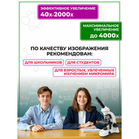 2. Увеличение от 40 до 2000 крат делает оптический инструмент подходящим для взрослых и школьников, готовящихся к экзаменам по ОГЭ, для научных исследований и домашних опытов, получения реальных практических навыков в области медицины и биологии.