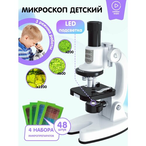 Образцами исследования могут быть любые природные материалы: от растений до насекомых. В подарок к микроскопу прилагаются 48 образцов для изучений. Развивающие эксперименты способствуют увлекательному изучению биологии и других наук. Биологический микроскоп оснащен 3 режимами увеличения и подсветкой, что повышает качество изображения. При производстве используется объектив с стеклянными линзами.