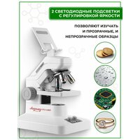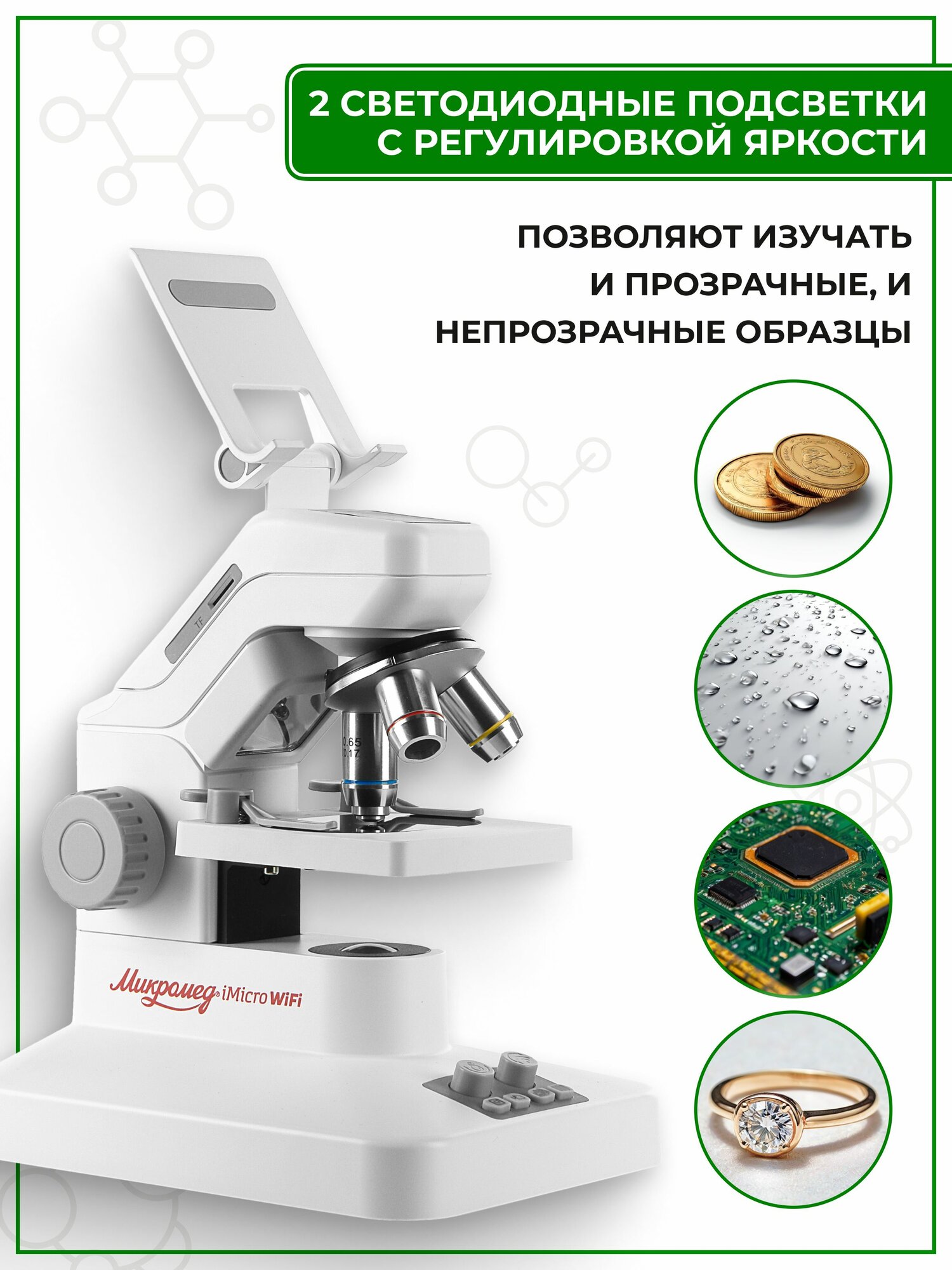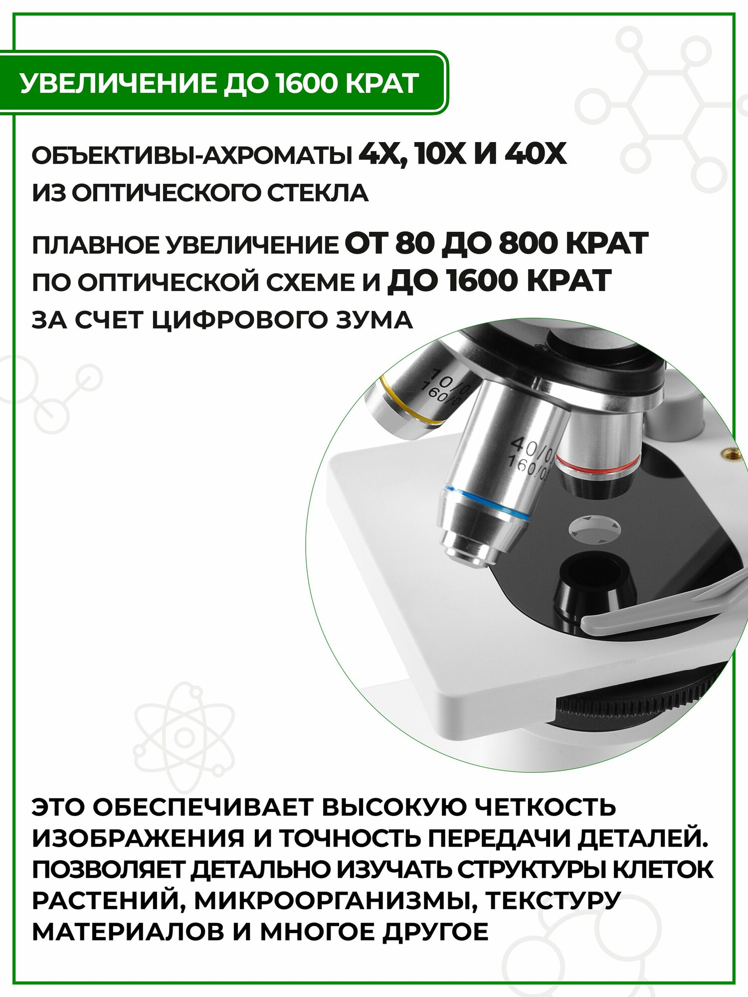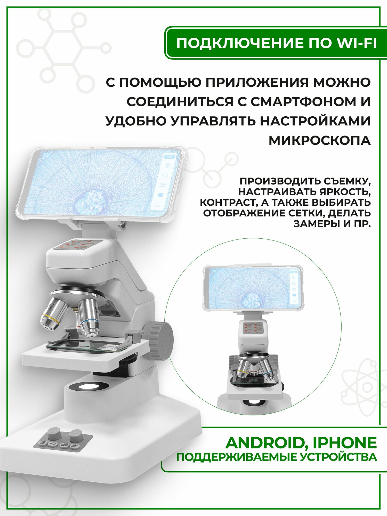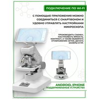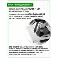 | Подробная комплектация | Основание со встроенным источником проходящего света, и регуляторами. Штатив с механизмом фокусировки Предметный столик со стеклом и зажимами, установленный на штативе микроскопа Оптическая головка со встроенной камерой, осветителем отраженного света, схемой визуализации и слотом для карты памяти Револьверное устройство с установленными объективами 4х, 10х и 40х Поворотный держатель для смартфона, закрепленный на оптической головке Набор для экспериментов Адаптер 5В 2А Кабель USB – Type-C Аккумулятор 18650 Кейс Руководство по эксплуатации и гарантийный талон |