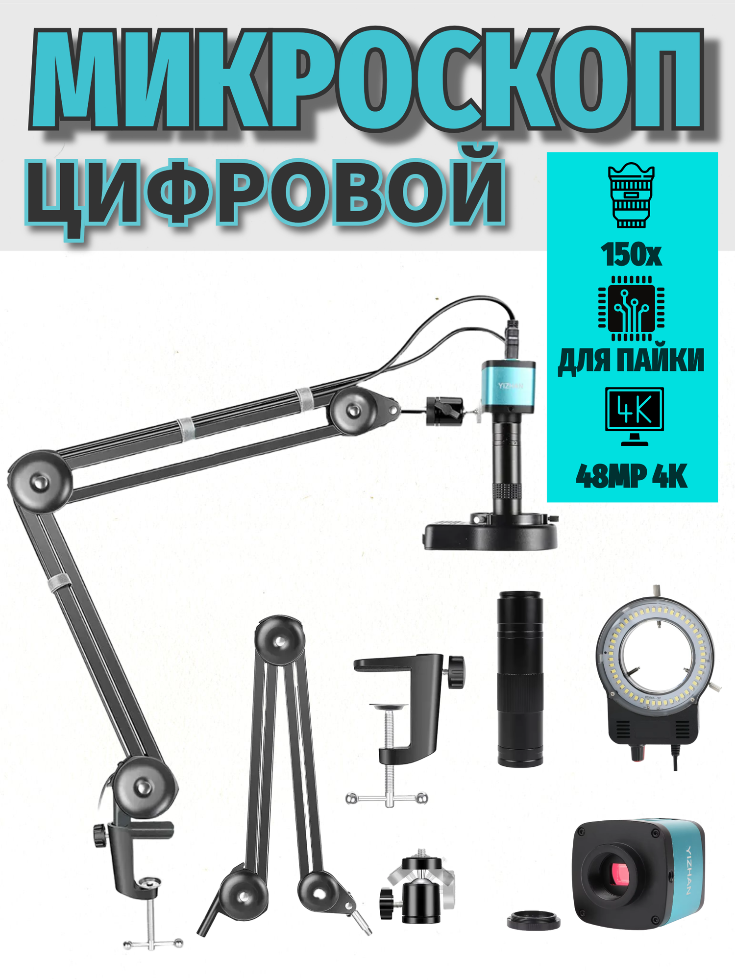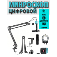Цифровой микроскоп 4K HDMI 150X 48MP для пайки с усиленным кронштейном и кольцевой подсветкой: Идеальное решение для профессиональной пайки и ремонта электроники!