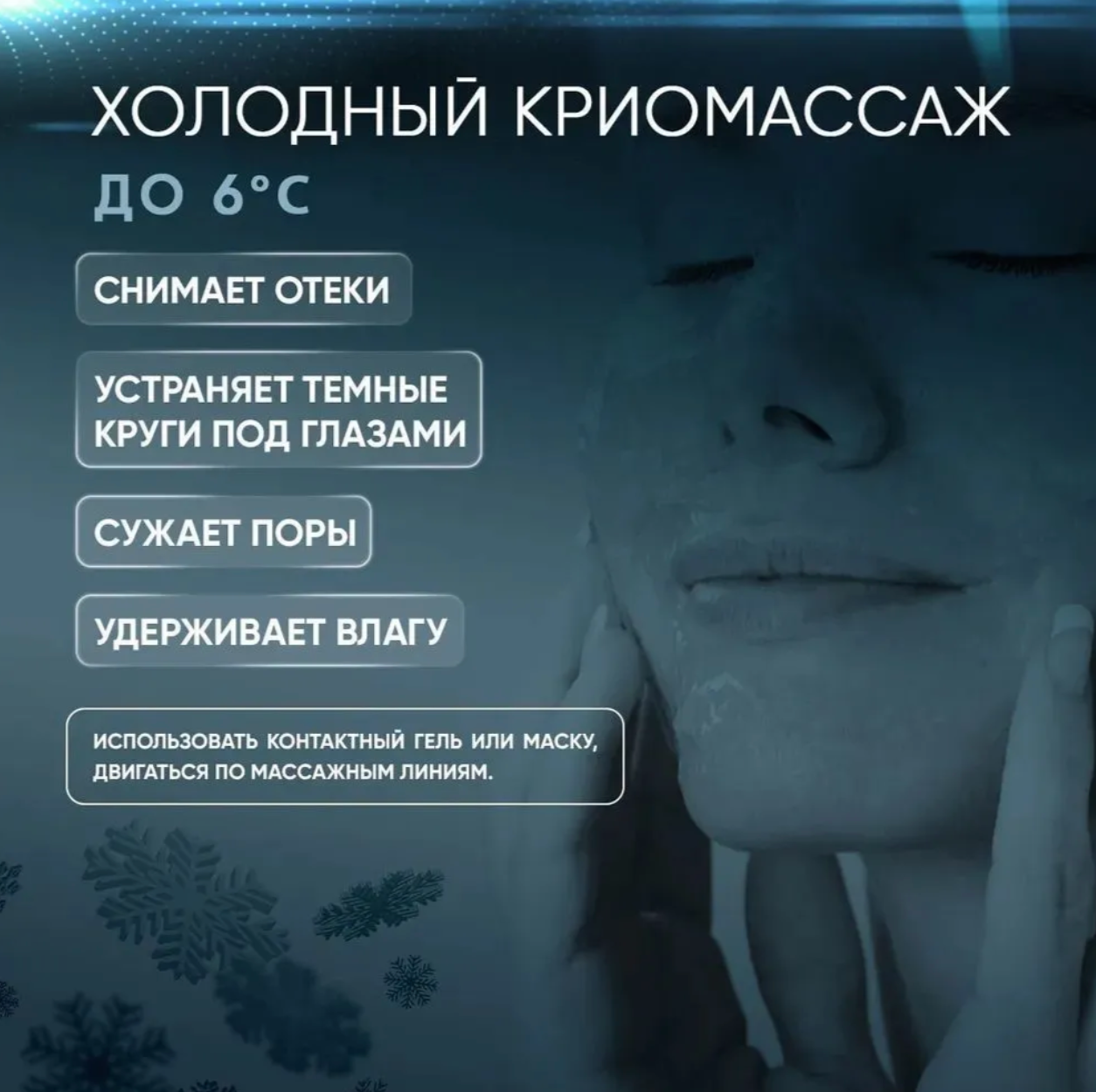 Криомассаж: нанесите контактный гель на лицо и проведите процедуру криомассажа по массажным линиям за 2 минуты.