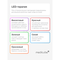 Аппарат оснащён функцией ультразвуковой вибрации, которая индивидуально адаптируется под каждый режим, усиливает эффект от процедуры и обеспечивает массаж. 5 LED-программ с разной длиной волны света позволяют подобрать оптимальный уход в зависимости от потребностей кожи: красный — повышает упругость и эластичность; оранжевый — для борьбы с пигментацией; зелёный — уплотняет ткани и разглаживает заломы; голубой — оказывает себорегулирующий эффект и сужает поры; фиолетовый — обеспечивает глубокое проникновение активов.