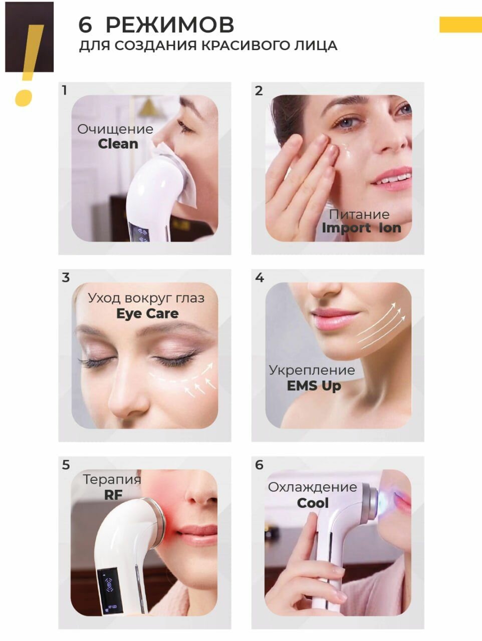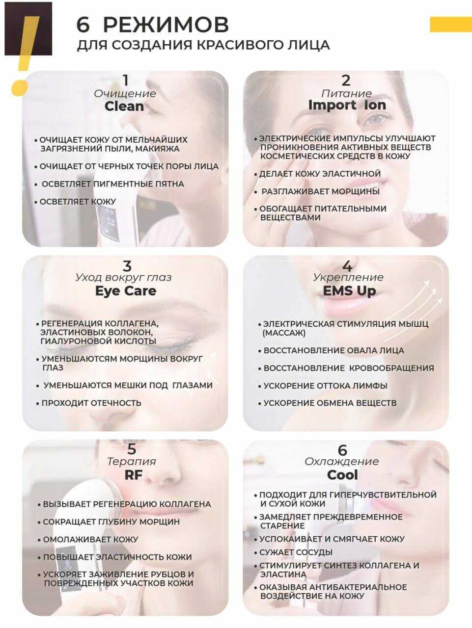 Немецкая компания Mismon несколько лет назад представила миру многофункциональное устройство для омоложения кожи лица и это был своего рода переворот индустрии! Им удалось качественно собрать в одном устройстве 5 технологий 1. RF лифтинг 2. EMS терапия 3. Фототерапия для лица (LED) 4. Ионофорез для лица (ION) 5. Вибрация для лица (микромассаж) Mismon RF - это многофункциональное косметическое устройство, основанное на радиочастотной технологии, представляет собой систему для домашнего использования, основанную на глубоком тепловом воздействии, для ионного очищения лица, ионного увлажнения, RF лифтинга, EMS, вибрации, охлаждения и LED терапии. RF: Генерирует тепло в более глубоких тканях для улучшения состояния кожи. ION (Ионная очистка): Благодаря экспорту ионов часть грязи, которую трудно удалить при мытье лица, убирается с поверхности кожи. Ионное увлажнение: Благодаря потоку ионов при ионофорезе питательные вещества продуктов по уходу за кожей легче проникают в кожу. Уход за глазами: Уход за нежной кожей вокруг глаз. EMS: Стимуляция более глубокой кожи с помощью умеренной и низкой частоты. Вибрация: Благодаря вибрационному массажу помогает ухаживать за лицом и способствует проникновению питательных веществ. Светодиодная терапия (LED): инфракрасный свет 650 нм против морщин и омолаживающий эффект, синий свет 465 нм улучшает жирность кожи и устраняет шрамы от угревой сыпи. Охлаждение: Охлаждает кожу, сужает поры и делает кожу более упру-гой.