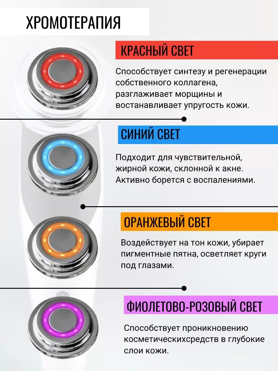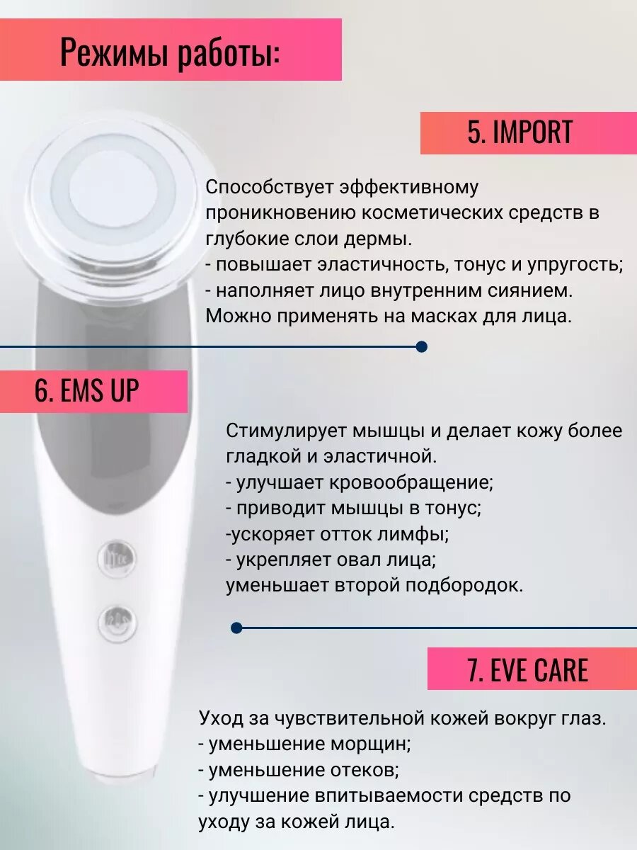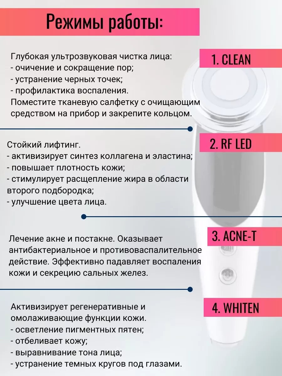 Глубокая очистка, горячий и холодный режимы, EMS терапия, увлажнение кожи и режим метаболизма коллагена - все это делает массажер многофункциональным и эффективным инструментом для ухода за кожей.