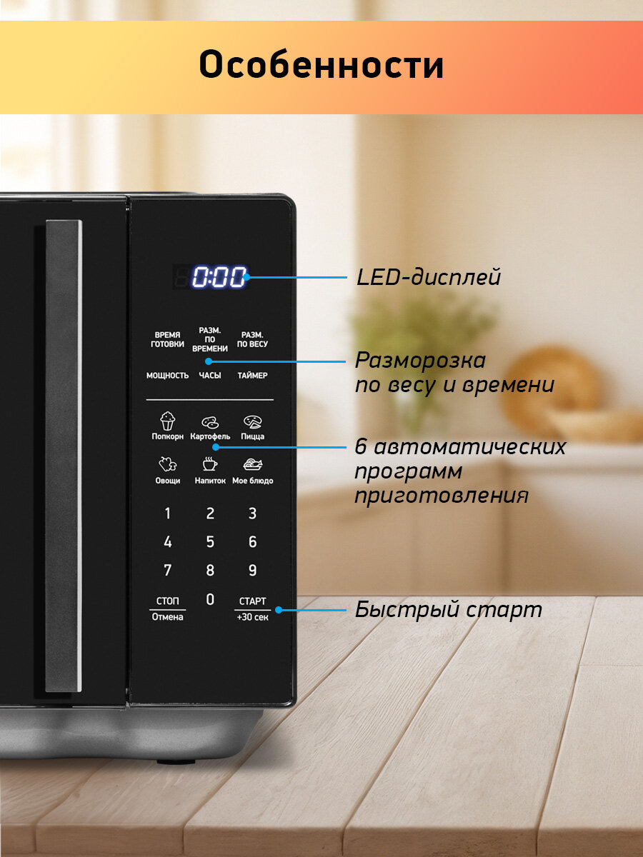 | Особенности | без поворотного стола, блокировка от детей, дисплей, кнопка +30 секунд, подсветка камеры, программирование рецептов в память |