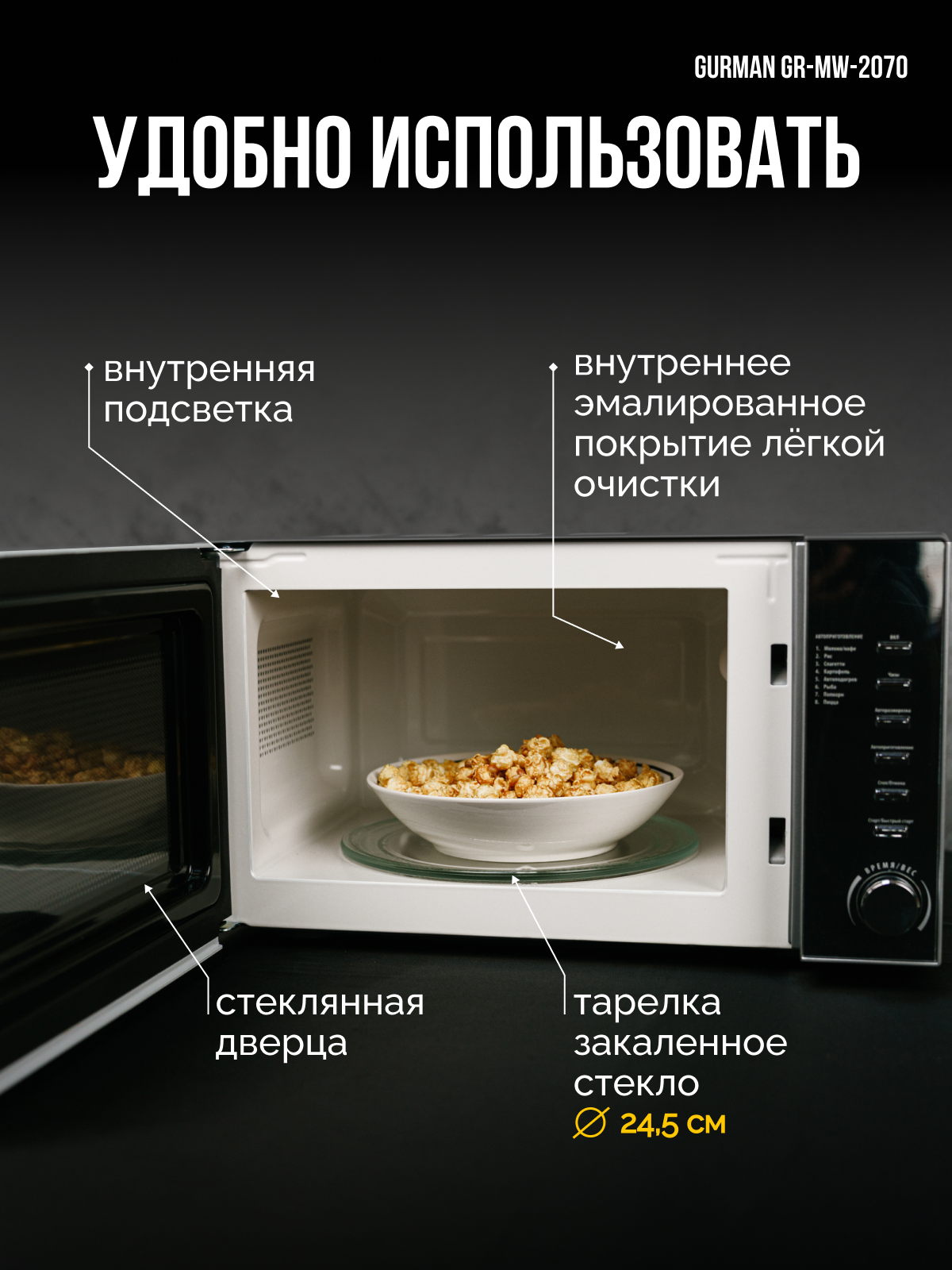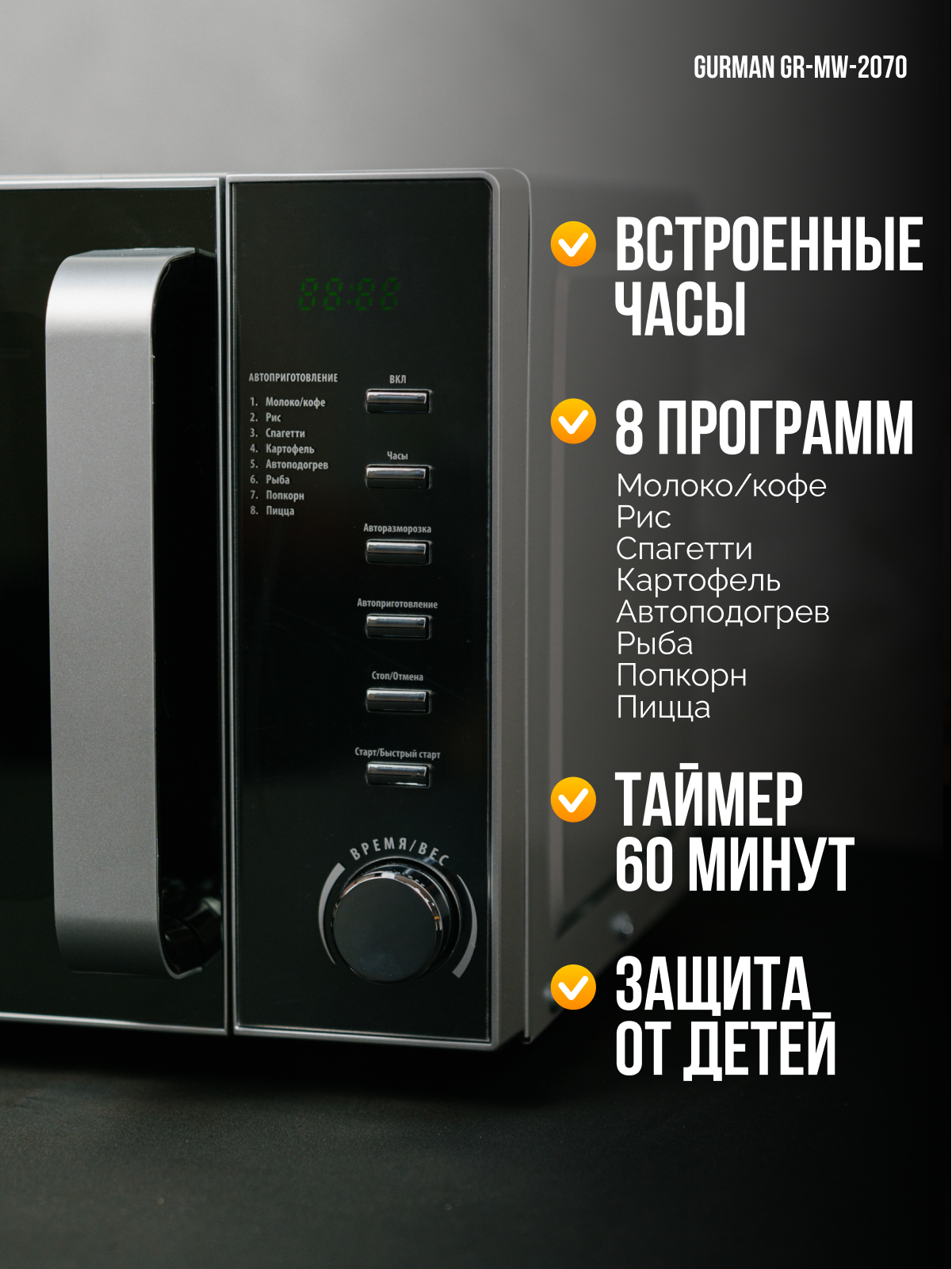 Микроволновая печь GURMAN GR-MW2070 - это надежное и функциональное устройство, которое сделает вашу кулинарную жизнь проще и приятнее. Приобретайте сейчас и наслаждайтесь быстрым и вкусным приготовлением пищи!
