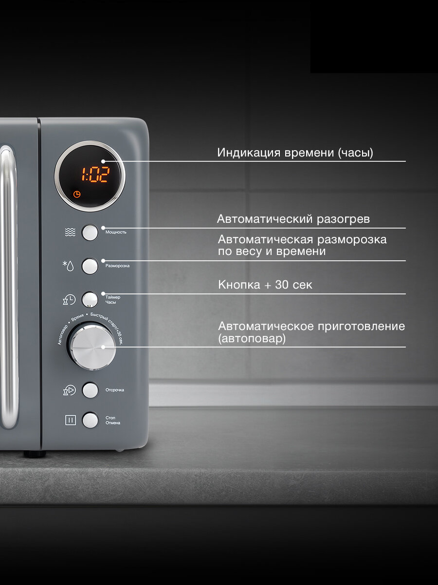 без поворотного стола, блокировка от детей, дисплей, кнопка +30 секунд, подсветка камеры, программирование рецептов в память, сенсор пара, система равномерного распределения микроволн, функция задержки пуска