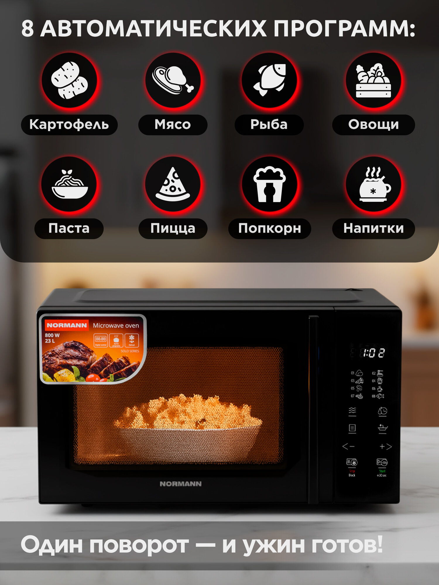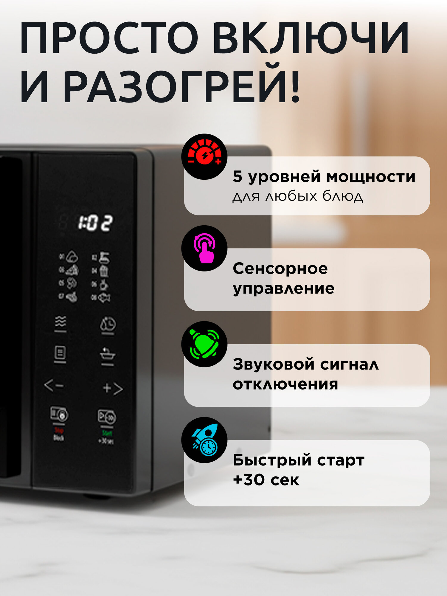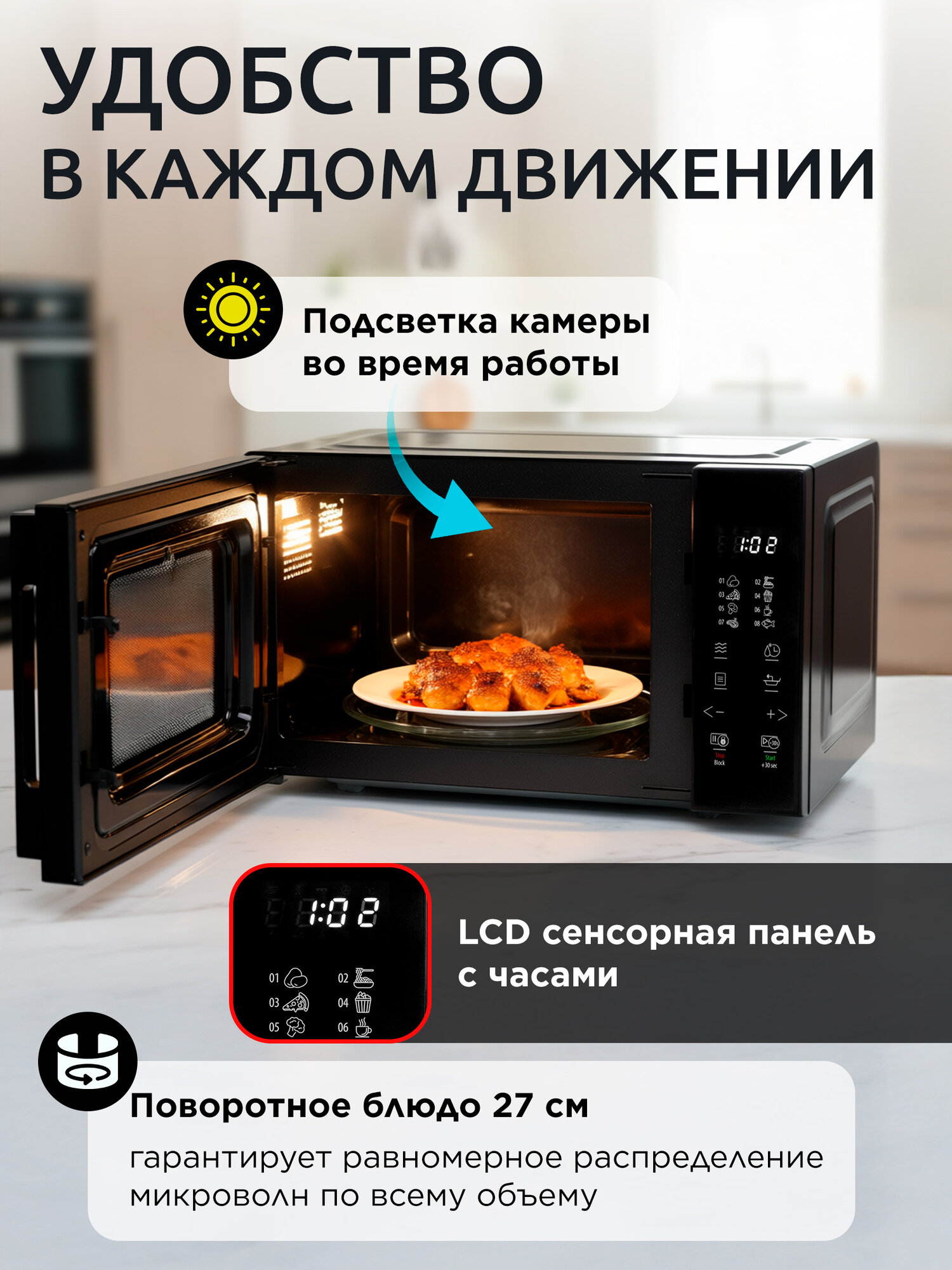 | Особенности | без поворотного стола, блокировка от детей, дисплей, кнопка +30 секунд, подсветка камеры |