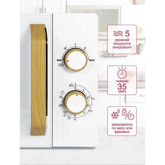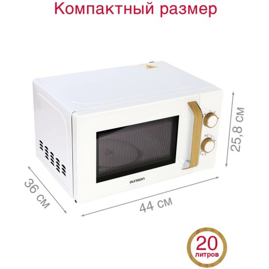 Вместительная микроволновая печь MМ2070B Oursson объёмом 20 литров и мощностью 1150 Вт отлично справляется с разогревом и разморозкой продуктов, а также с приготовлением разнообразных блюд. Микроволновка имеет удобную панель управления с механическим таймером от 5 до 35 минут и регулировкой одного из 5 уровней мощности, включая функцию автоматической разморозки по весу. Внутренняя камера с эмалевым покрытием легко очищается, а функция автоотключения при перегреве и перегрузке обеспечивает безопасность использования. Этот кухонный помощник со всеми важными опциями объединяет в себе удобство, стильный дизайн, высокую надёжность, компактность и энергоэффективность. Микроволновая печь ОРСОН — это идеальный подарок маме, бабушке, сестре, на день рождения. Она прекрасно подойдет для дома, для дачи, для кухни.