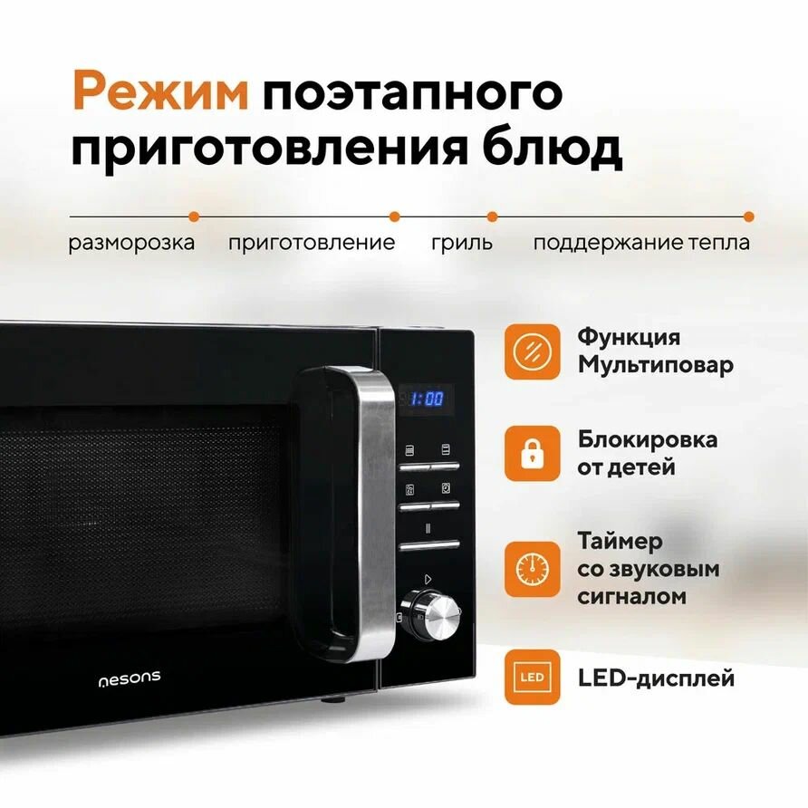 Микроволновая печь с грилем объемом 23 литра черного цвета NS-MW23BGD90GB от известного бренда NESONS станет незаменимым помощником на вашей кухне, предлагая современные функции и элегантный дизайн. Эта модель представляет собой многофункциональное устройство, сочетающее в себе классический режим приготовления пищи и гриль, что позволяет готовить разнообразные блюда с хрустящей корочкой. Её мощности хватает для быстрого и равномерного разогрева, а также для полноценного приготовления самых разных продуктов. Оснащенная удобной панелью управления и множеством автоматических программ, она упростит процесс готовки, позволяя вам наслаждаться своими кулинарными шедеврами без лишних усилий. Благодаря компактным размерам и стильному черному корпусу, эта микроволновая печь отлично впишется в любой интерьер, добавляя ему современности и изысканности. Бытовая техника такого уровня поможет вам не только сэкономить время, но и разнообразить ежедневное меню. Будь то разогрев вчерашнего ужина или приготовление полноценного блюда на ужин, NS-MW23BGD90GB справится с задачей на отлично. Она оснащена такими полезными функциями, как разморозка, автоматическое отключение при завершении программы и защита от перегрева, что делает её использование безопасным и удобным. Энергосберегающая технология и долговечные материалы обеспечивают длительный срок службы устройства, гарантируя вам стабильную работу на протяжении многих лет. Позвольте этой микроволновой печи стать надежным партнером на вашей кухне, воплощая в реальность любые кулинарные задумки с легкостью и комфортом.