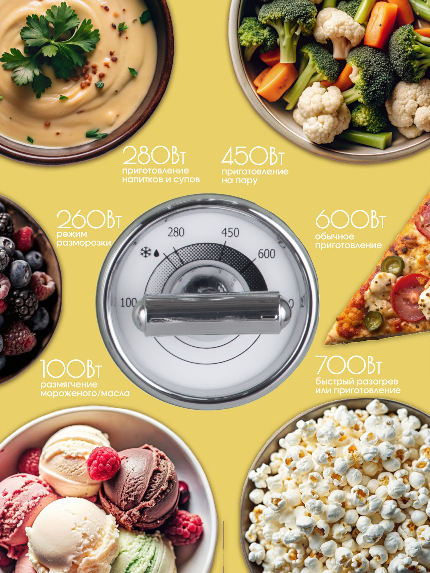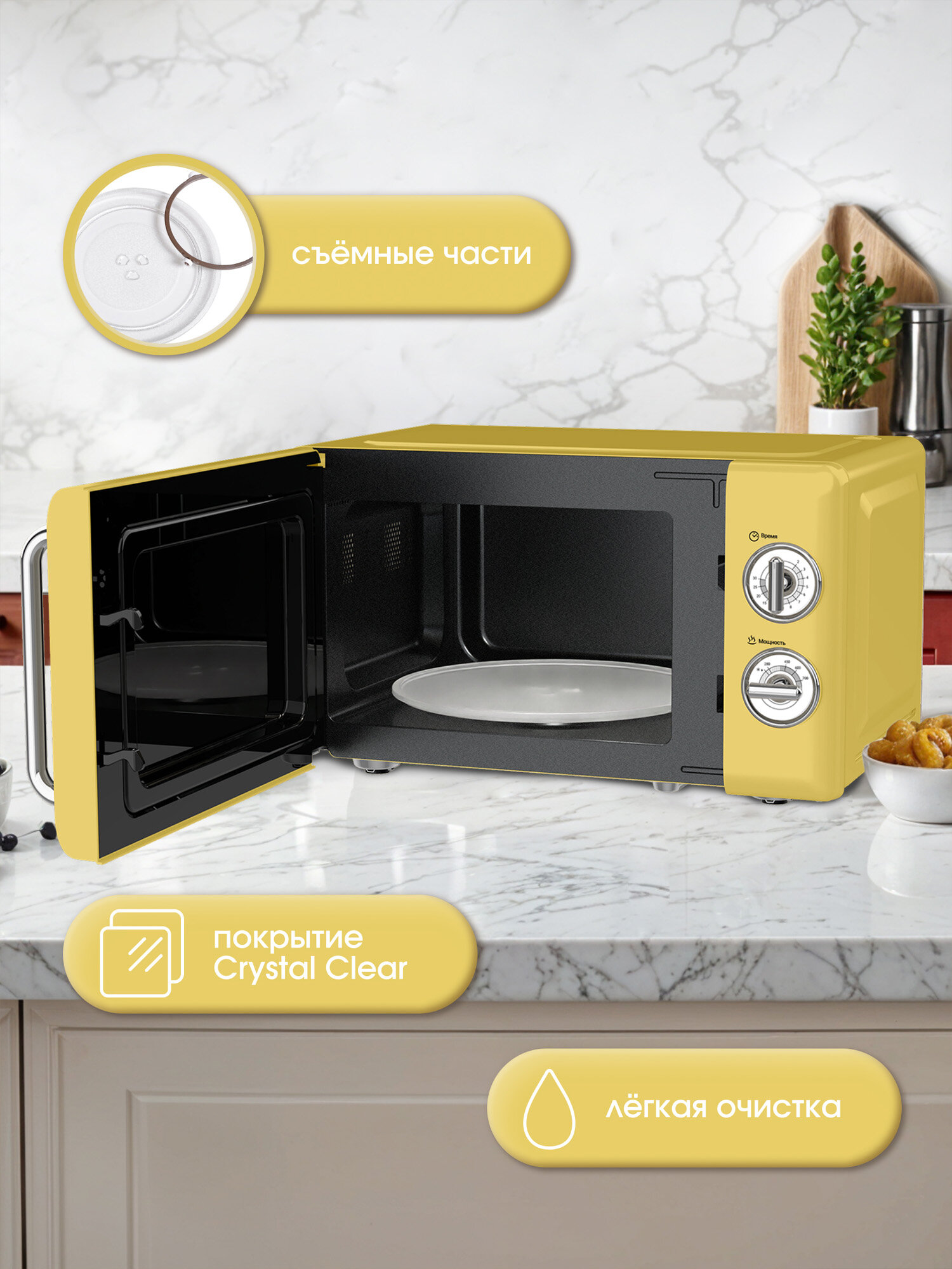 Микроволновая печь TESLER MM-2045 YELLOW, 20 л, 700 Вт, 6 уровней мощности, таймер, подсветка