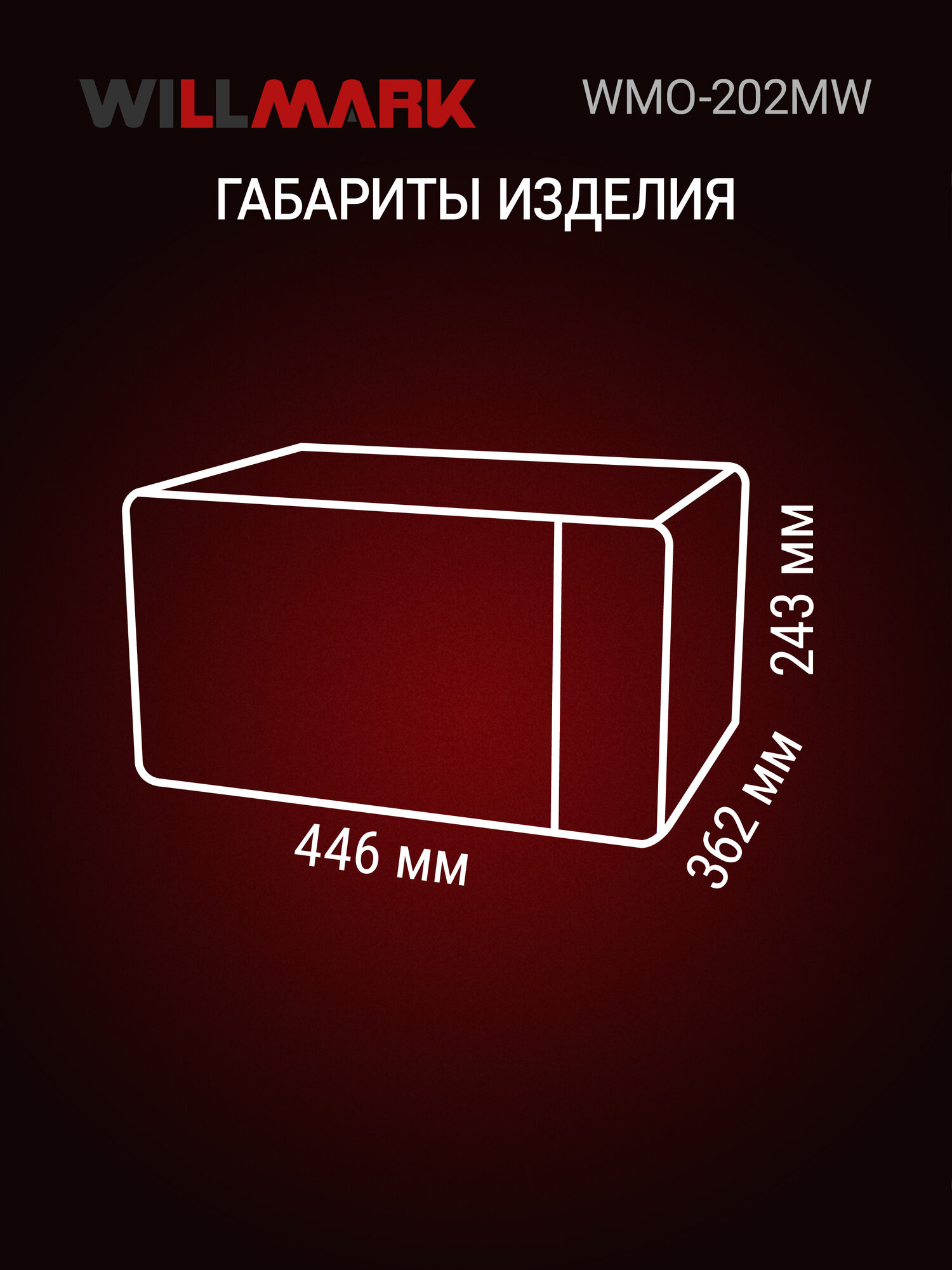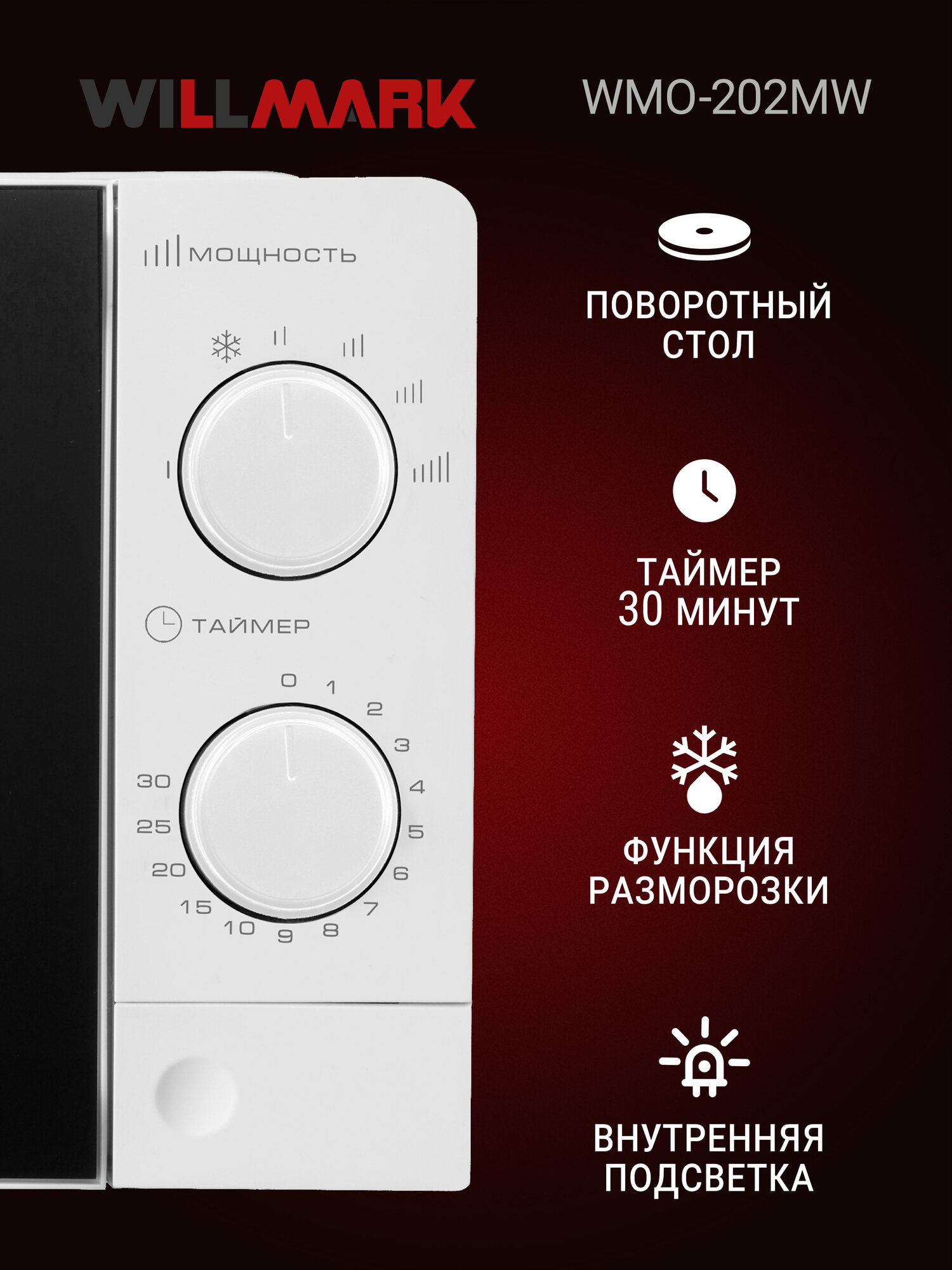 Купить Микроволновая печь WILLMARK WMO-202MW (20л,700Вт, механич. ПУ, кнопка д/л откр. дверцы,6 ур. мощн, белая) с доставкой по всей России.