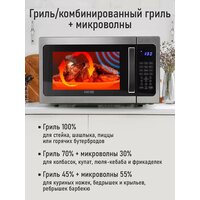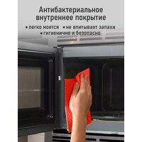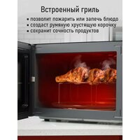 Данная модель оснащена вместительной камерой объемом 35 литров, стеклянным вращающимся подносом для равномерного распределения тепла, интуитивно понятной сенсорной панелью управления и цифровым дисплеем для отображения времени до конца работы.