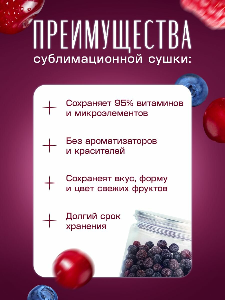 Микс из сушеных ягод черники, малины и вишни fojo - это натуральный продукт, изготовленный с применением технологии сублимационной сушки. Благодаря этому процессу, сохраняются все полезные свойства и вкусовые качества фруктов, а влага удаляется при низких температурах и минимальном воздействии на структуру плодов. Сублимированные ягоды черники, малины и вишни подходят для добавления в каши, йогурты или смузи, обогащая блюда натуральными компонентами. Они также могут использоваться как самостоятельный перекус или ингредиент в кулинарии. Продукт готов к употреблению и не требует дополнительной обработки. Он подходит для широкого круга потребителей, включая тех, кто обращает внимание на состав продуктов и их влияние на здоровье. Микс из сушеных ягод черники, малины и вишни fojo упакован в пластиковую банку, что обеспечивает удобство хранения и сохранность продукта. Продукт хранить при температуре от 0 °C до +25 °C и относительной влажности воздуха не более 75%. В состав микса входят витамины, антиоксиданты и микроэлементы, которые особенно ценятся в рационе людей, ведущих здоровый образ жизни и придерживающихся принципов правильного питания. Микс из сушеных ягод черники, малины и вишни fojo не содержит сахар, консерванты, ГМО, ароматизаторы, без вкусовых добавок и является постным, вегетарианским и диетическим продуктом. Вес микса составляет 75 г, а его максимальная и минимальная температура хранения - 25 и 0 градусов соответственно.