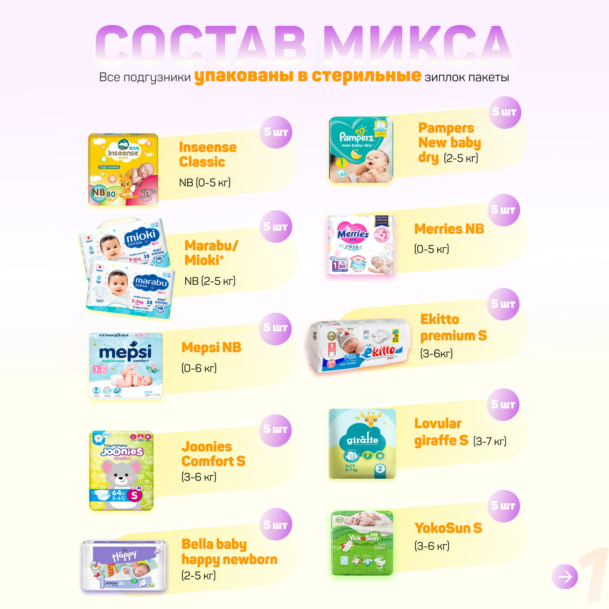 Микс набор пробников подгузников для новорожденных 0-8 кг, 50 шт в наборе, 10 брендов по 5 шт: сравнение цен, характеристики, фото, актуальное наличие и цены.
