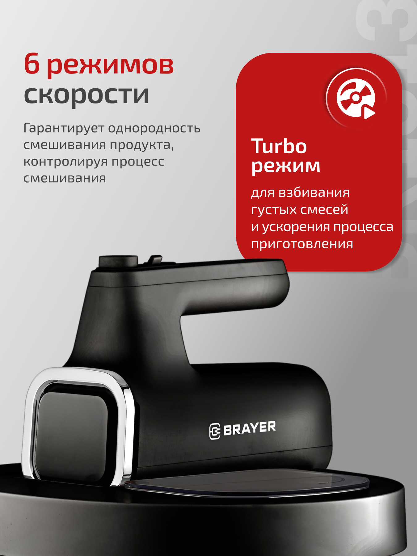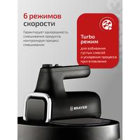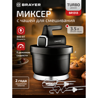 Купить Миксер BRAYER 1313, 800Вт, 6 скоростей, нержавеющая сталь, 3,5л, с вращением чаши с доставкой по всей России.