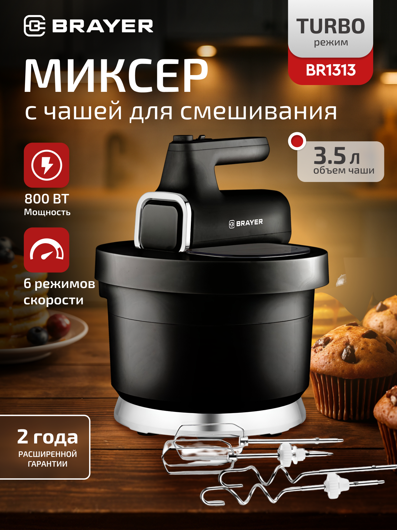 Миксер BRAYER 1313, 800Вт, 6 скоростей, нержавеющая сталь, 3,5л, с вращением чаши: сравнение цен, характеристики, фото, актуальное наличие и цены.