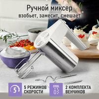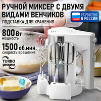 800Вт, 5 скоростных режимов, режим Турбо, кнопка извлечения насадок, 2 комплекта насадок: для замеса теста, для взбивания яиц/крема. Материал - пластик/нержавеющая сталь. Металлические насадки. Благодаря устойчивой и надежной конструкции миксер окажется незаменимым помощником на кухне. С его помощью вы сможете замесить тесто, создать крема различной степени сложности, приготовить пюре. Конструкция миксера позволяет использовать его в том числе в качестве ручного, что очень удобно. Миксер имеет 5 скоростных режимов, 2 венчика для взбивания яиц и крема, 2 насадки для замеса теста. Миксер равномерно взбивает продукты, насыщает их кислородом: взбитая масса получается пышной и нежной. Прибор компактный и отвечает наивысшим стандартам качества и безопасности.