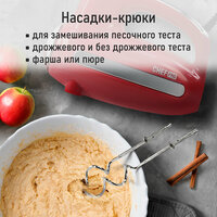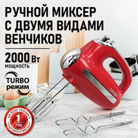 2000W, 5 скоростных режимов, 2 венчика для взбивания, 2 насадки для замеса, турбо режим, кнопка извлечения насадок, корпус - пластик, насадки - металл Компактный миксер с 5 скоростными режимами, турбо режимом и 2 комплектами насадок подходит для смешивания жидкостей, взбивания яиц или крема, приготовления пюре. Крючками можно замесить тесто для любимой выпечки. Миксер удобен и прост в использовании, имеет эргономичный дизайн корпуса, выполненного из высококачественного пластика. 5 скоростных режимов позволят выбрать оптимальную скорость вращения насадок для любого продукта. Кнопка извлечения насадок упрощает уход за миксером после окончания работы. Миксер легко впишется в дизайн любой кухни, не занимая много места, но при этом оставаясь всегда под рукой.