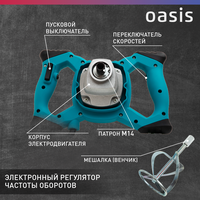 Миксер строительный Oasis предназначен для перемешивания компонентов (сухой смеси и жидкости) при получении различных строительных и отделочных материалов (бетона, штукатурки, плиточных и обойных клеев, дисперсных красок и т. д.).
