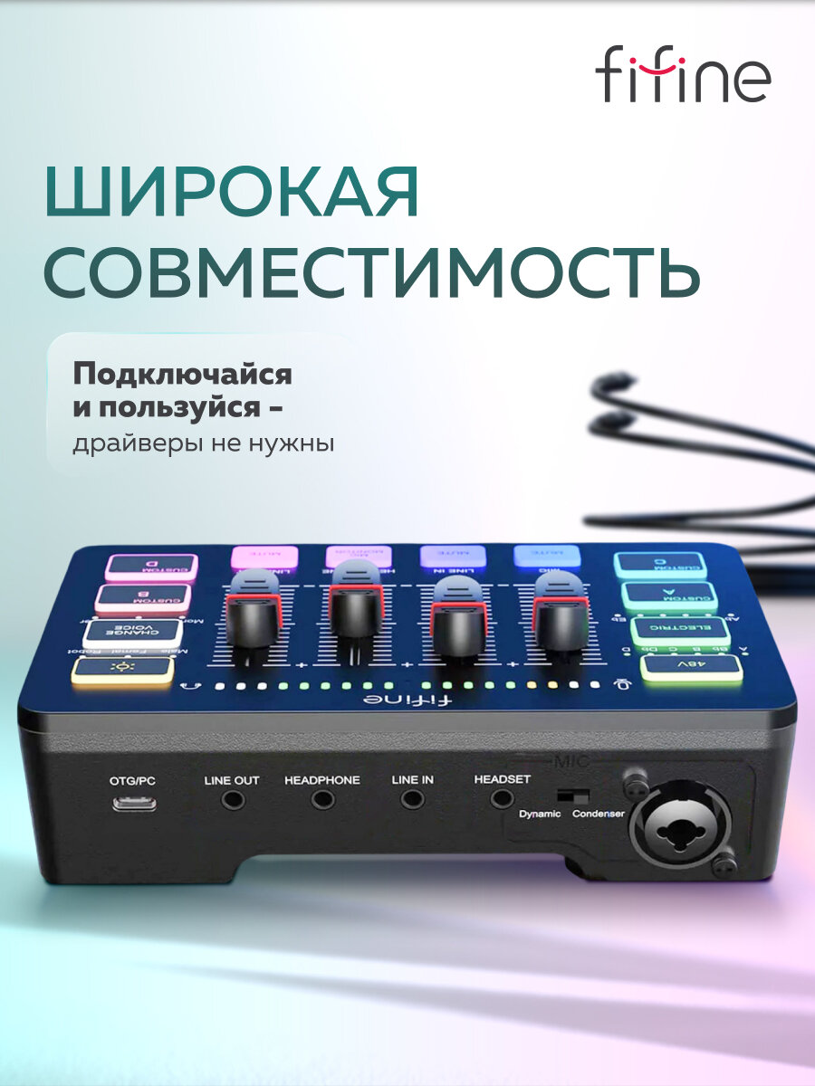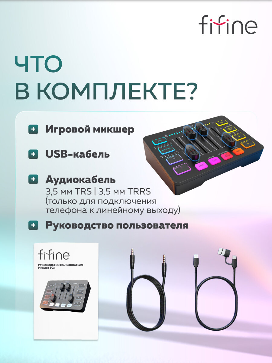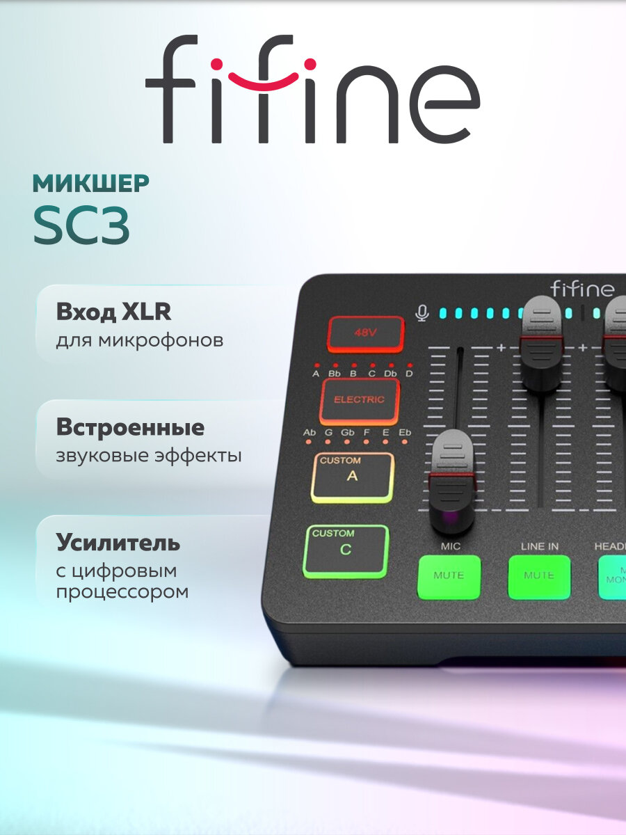 Микшер / Звуковая карта Fifine mixer SC3 (Black) / звуковые эффекты / RGB подсветка: сравнение цен, характеристики, фото, актуальное наличие и цены.