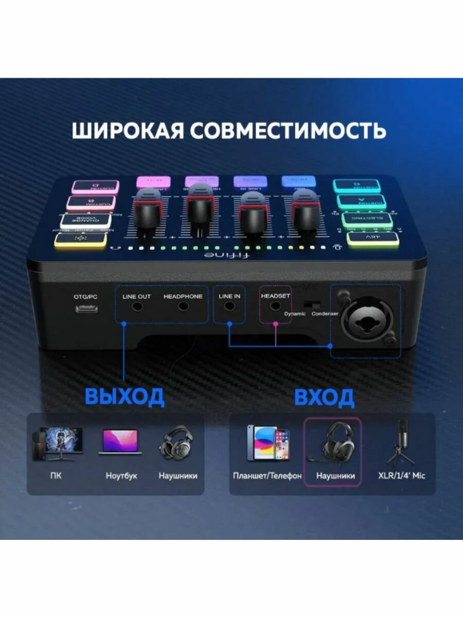 Микшерный пульт - это важное оборудование для геймеров, стримеров и для тех, кто занимается звукозаписью, созданием музыки, подкастов или организацией различных мероприятий. Этот устройство предназначено для смешивания звуковых сигналов с различных источников и управления ими. Микшерный пульт с эффектами - это идеальное решение для всех профессионалов, которые стремятся создавать качественный звук с добавлением различных эффектов. Внешняя звуковая карта, микшер fifine SC3, это не просто аудиомикшер - это настоящий музыкальный инструмент, который позволит почувствовать себя настоящим профессионалом, настраивать и управлять звуком. Он оснащен тремя моно каналами и двумя стерео каналами, обладает RGB подсветкой, что делает его не только функциональным, но и стильным аксессуаром. Микшер для ПК с встроенным усилителем мощности обеспечивает четкий и ровный звук. Встроенный цифровой процессор эффектов (DSP) поможет выбрать различные эффекты, такие как реверберация или задержка. USB аудио интерфейс позволяет записывать звук непосредственно на компьютер без использования дополнительного оборудования. С его помощью вы сможете превратить свой ПК в профессиональную студию звукозаписи. С этим профессиональным микшером пользователь может точно настроить каждый звуковой модуль под свои потребности. Создавайте музыку, записывайте подкасты, проводите онлайн трансляции - все это станет проще с микшерным пультом с эффектами. Одним из основных преимуществ микшерного пульта является его простая эксплуатация. Даже новички смогут быстро освоить управление этим устройством благодаря интуитивно понятному интерфейсу и легкости в настройке. Это устройство не только облегчает процесс работы с звуком, но и позволяет раскрыть ваш творческий потенциал. Если вы стремитесь к идеальному звучанию и хотите иметь полный контроль над аудио-сигналами, то микшерный пульт - ваш незаменимый помощник. Не упустите шанс улучшить качество звука! Покупайте его прямо сейчас и достигните новых высот в мире звука!