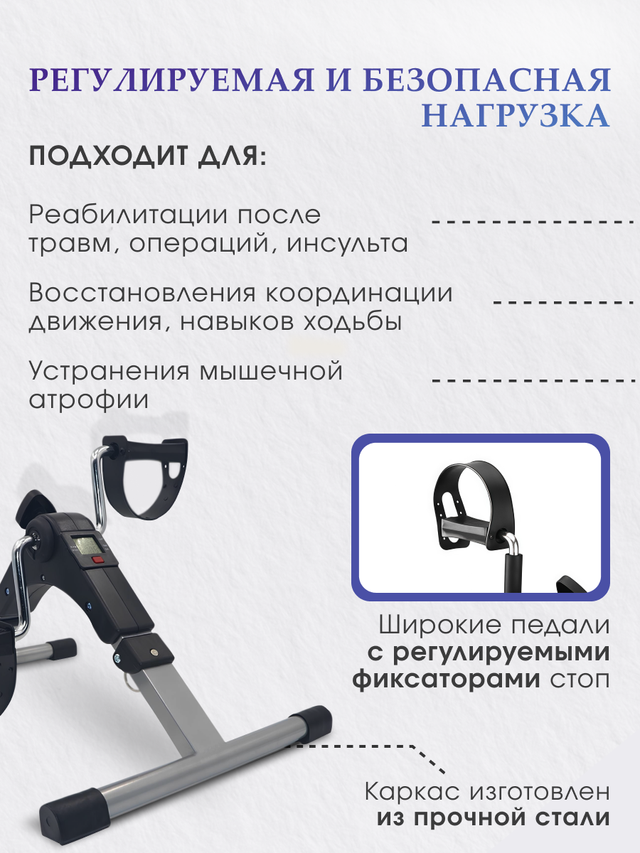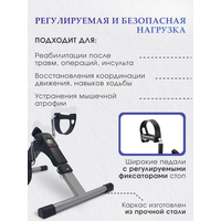 Велоnренажер применяется для разработки конечностей пожилых людей, для тренировки людей, имеющих ограниченные физические возможности и просто для занятий в домашних условиях как взрослым, так и детям. Педальный тренажер для ног и рук можно использовать в качестве реабилитационного тренажера после инсульта. Резиновые накладки на ножки тренажера предотвращают скольжение и защищают от царапин поверхность стола и пола. Занятия на велотренажере осуществляются в положении сидя, что обеспечивает одновременную нагрузку на мышц ног, рук и спины. Нагрузка изменяется путем регулирования вентиля, а частоту вращения педалей вы регулируете сами. Мини велотренажер помогает: восстановить навыки ходьбы (можно использовать с первых дней реабилитации после инсульта), устранить мышечную атрофию, восстановить функцию рук и ног, позволяет возвратить нормальный тонус мышцам, и тренажер можно использовать для похудения, аэробная нагрузка полезна для сердечно-сосудистой и дыхательной системы.