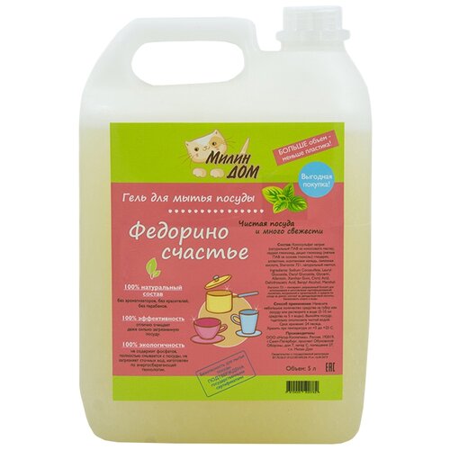 Милин дом Гель для мытья посуды Федорино счастье, 5 л, 5 кг: сравнение цен, характеристики, фото, актуальное наличие и цены.