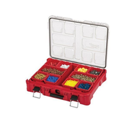 Красные модульные системы хранение Милуоки сделаны для рынка США и производятся в Израиле. Ящик 48228430 является органайзером, он всегда ставится наверх "пирамиды" ящиков. Сверху на него уже нельзя закрепить ящики. В комплект данного органайзера входят 8 малых (10 х 10 см) и 2 больших лотка (20 х 10 см).