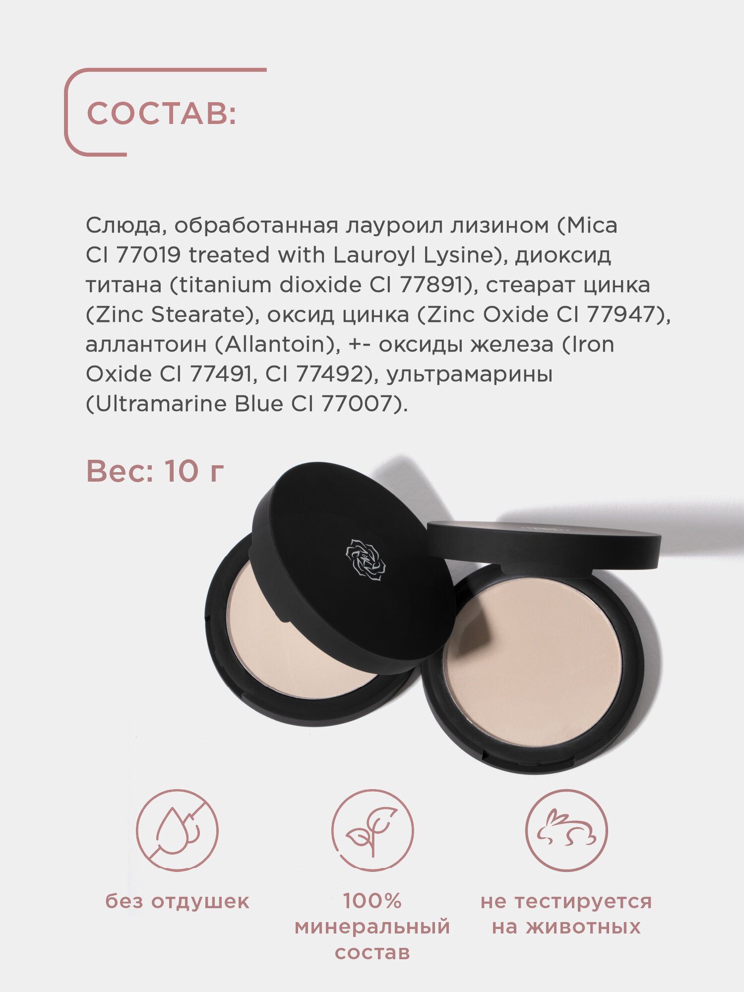 | Состав | INCI: слюда (Mica CI 77019) and лауроил лизин (Lauroyl Lysine), диоксид титана (Titanium dioxide Cl 77891), оксид цинка (Zinc Oxide), стеарат цинка (Zinc Stearate), аллантоин (Allantoin), +- оксиды железа (Iron Oxide CI 77491, CI 77492), ультрамарины (Ultramarine Blue CI 77007) ОПИСАНИЕ |