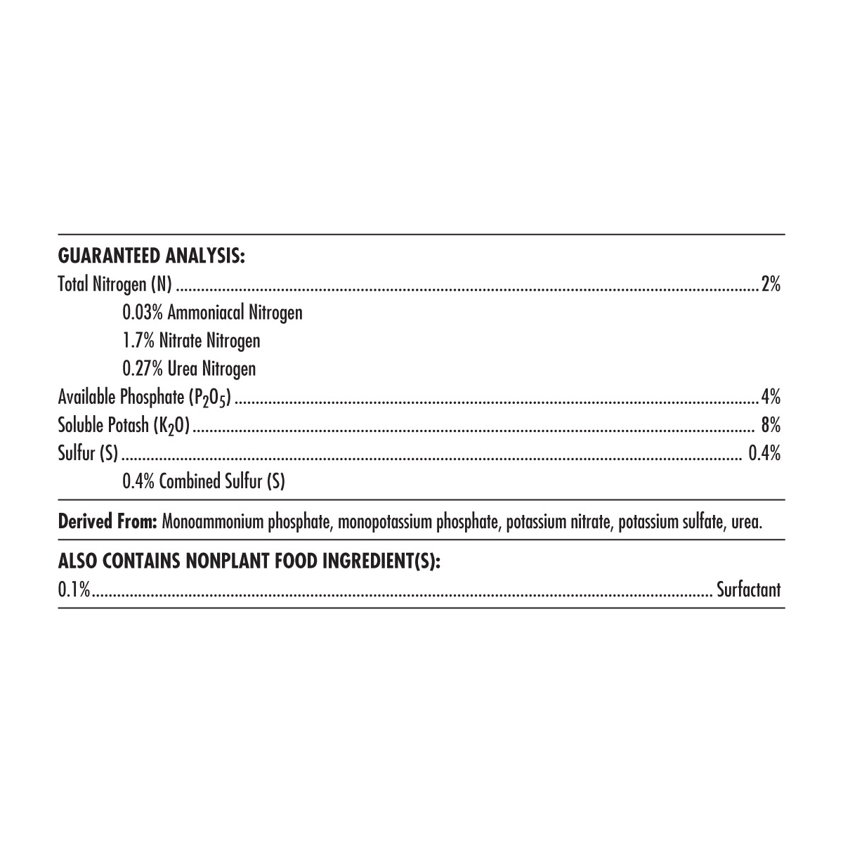 Часть А: 4.3-0-3.1 Азот (N) - 4.3% 0.10% - Аммиачный Азот 2.10% - Нитратный Азот 2.10% - Водорастворимый Азот Растворимый углекислый Калий (K2O) - 3.1% Кальций (Ca) - 1.7% Молибден (Mo) - 0.0008% Часть B: 1.5-6.1-5.7 Азот (N) - 1.50% 0.02% - Аммиачный Азот 0.50% - Нитратный Азот 0.98% - Водорастворимый Азот Чистый Фосфат (P2O5) - 6.10% Растворимый углекислый Калий (K2O) - 5.70% Магний (Mg) - 1.00%