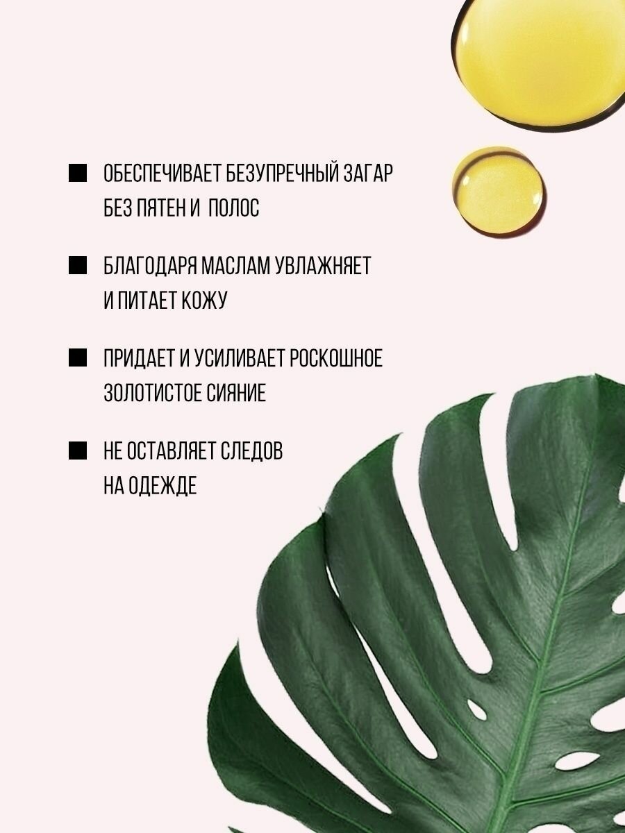 Бронзирующий эликсир на основе 7-ми масел (Аргановое, ореха Макадамии, Кокосовое, Жожоба, плодов Шиповника, Виноградных косточек, Авокадо) и высококонцентрированного DHA помогает создать индивидуальный оттенок, регулировать интенсивность загара. Природные компоненты, мультивитамины и микроэлементы сохраняют липидный барьер, регенерируют, омолаживают, тонизируют. Улучшают тон и микрорельеф кожи, максимально сохраняют и продлевают стойкость полученного загара.